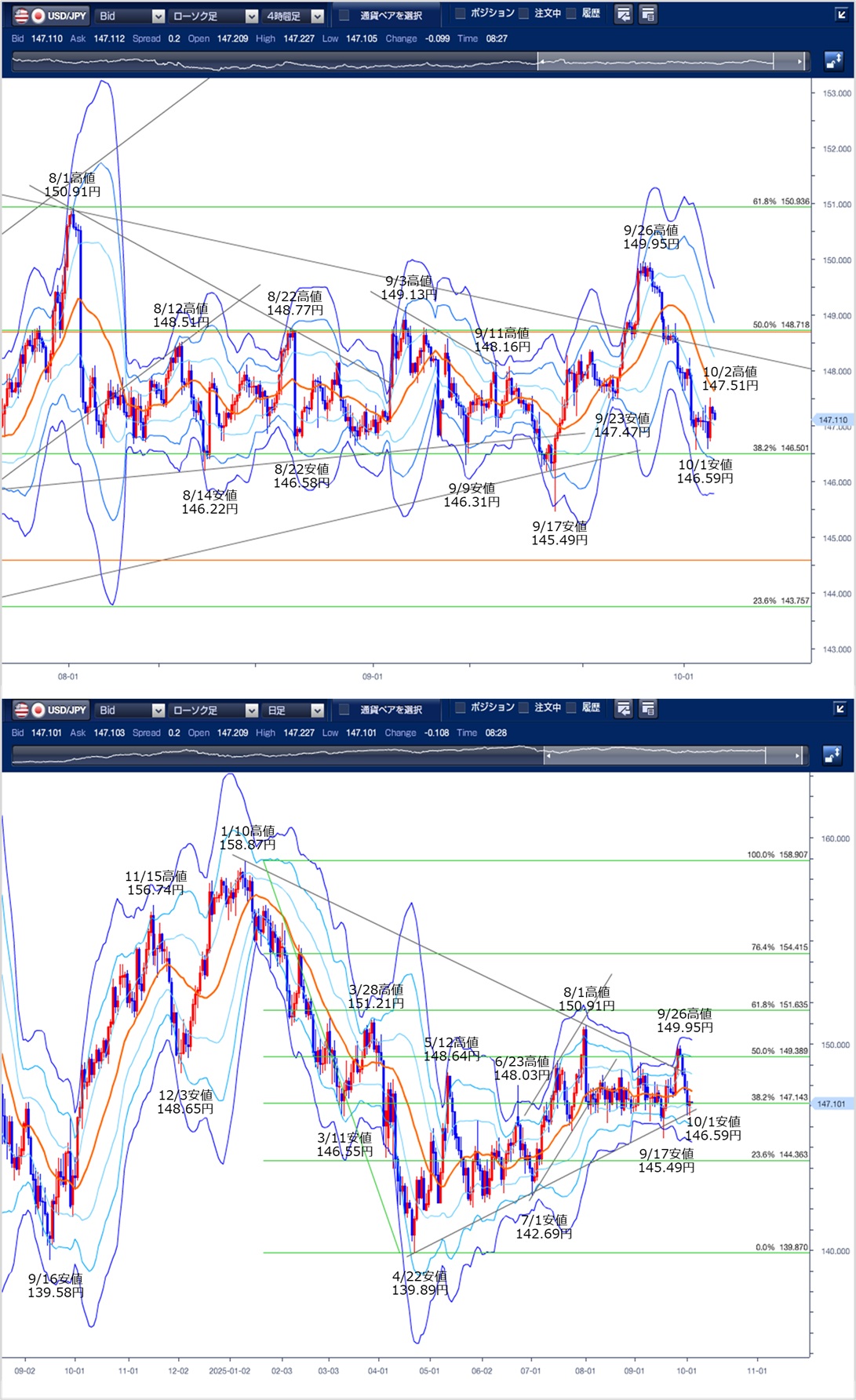 内田日銀副総裁による「見通しが実現していくとすれば引き続き利上げ」の発言や、米政府機関の一部閉鎖による米経済後退懸念が台頭し、リスク回避のドル売り円買いが優勢となり、146.60円まで下落しました。ただ、前日安値146.59円が意識されると下げ渋り、146.86円まで値を戻しました。