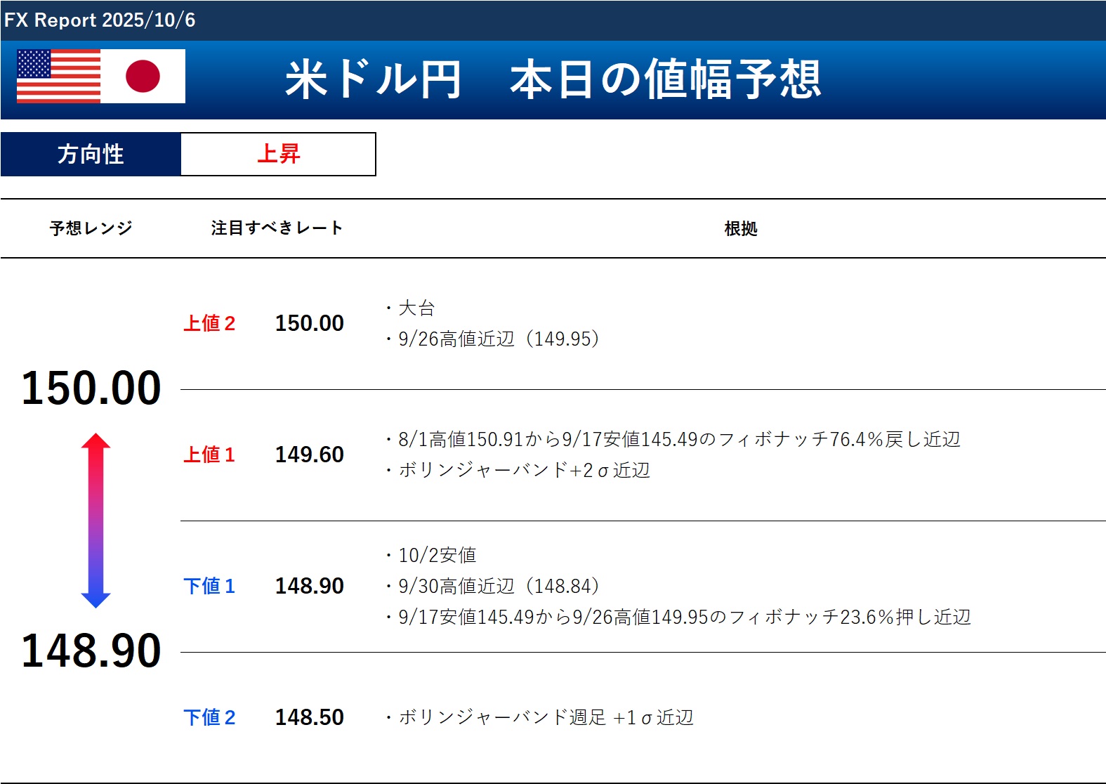 以上のことから、本日のドル円の方向性と予想レンジは以下の通りです。