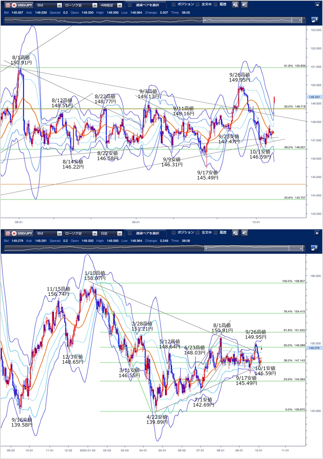 4時間足および日足のボリンジャーバンドは中心線が上向きで、エクスパンションを形成しており、強い上昇を示唆しています。