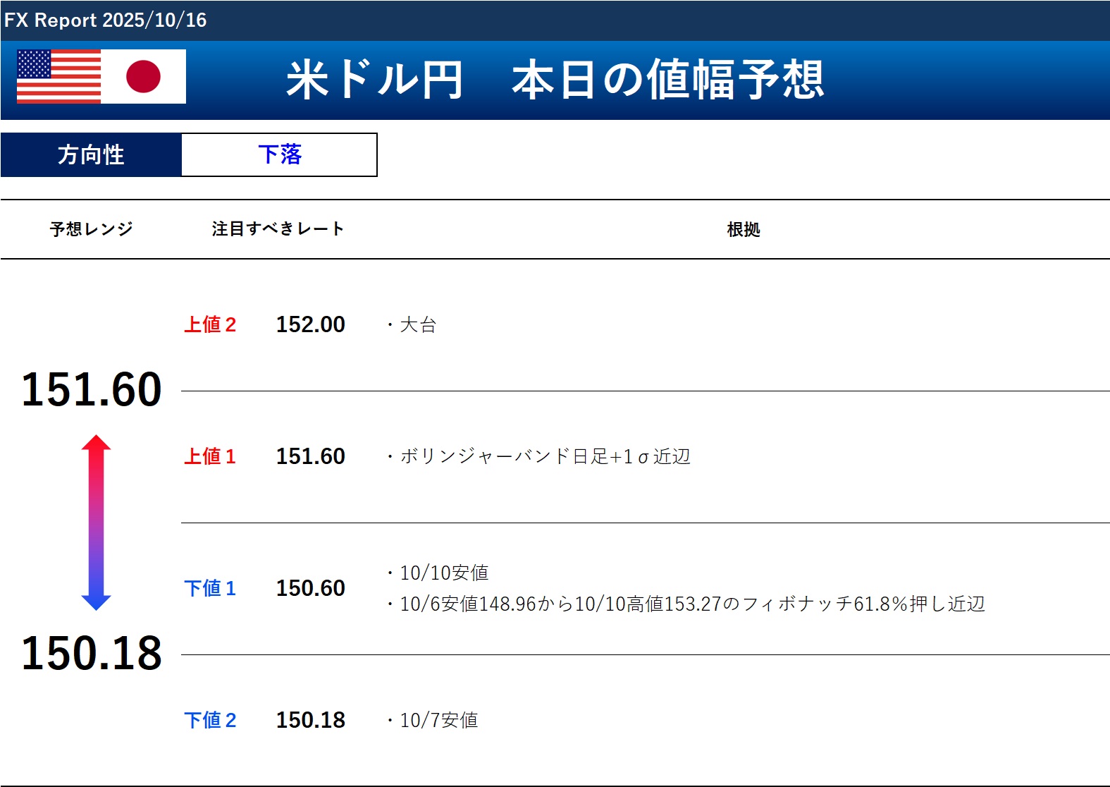以上のことから、本日のドル円の方向性と予想レンジは以下の通りです。