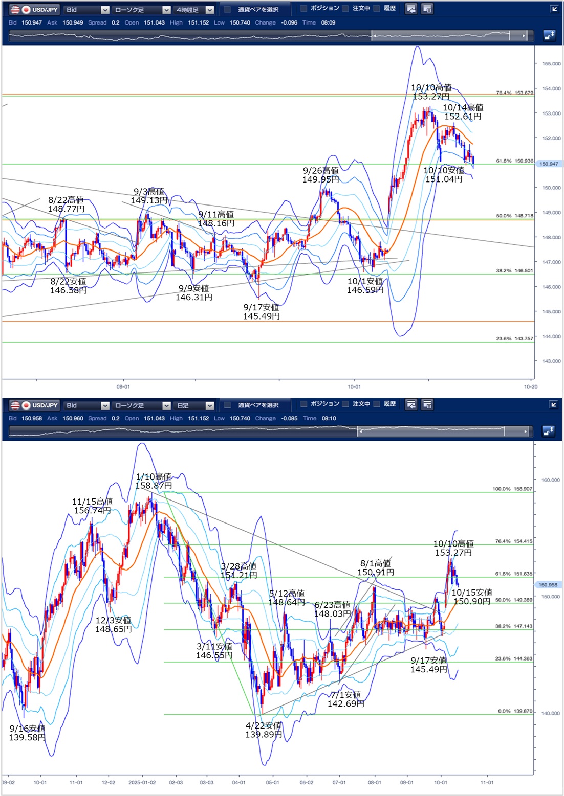 4時間足のボリンジャーバンドは中心線が下向きとなっており、下落を示唆しています。