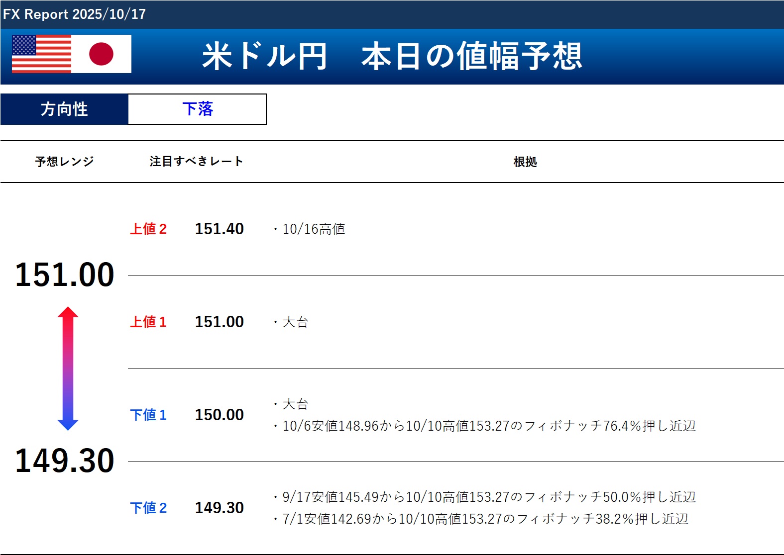 以上のことから、本日のドル円の方向性と予想レンジは以下の通りです。