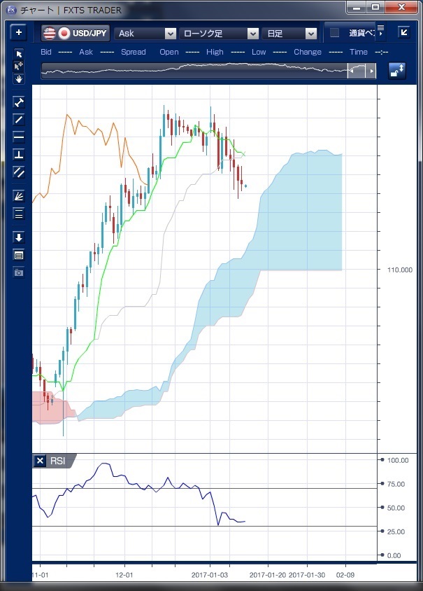 先週のドル/円相場は、週初に117円台半ばの高値をつけたものの、11日に行われたトランプ次期米大統領の記者会見で経済政策などの詳細について言及しなかったことや保護主義的な通商政策に対する市場の懸念が強まり、ポジション調整的なドル売りが優勢な展開となり一時昨年12月8日以来となる113円76銭まで下落しました。 ただし、週末に発表された米ミシガン大学消費者信頼感指数速報値の1年先の期待インフレ率が12月の2.2%から2.6%に上昇し、5年先の期待インフレ率が前月の2.3%から2.5%に上昇したことなどを受け、米長期債利回りは下げ止まり、リスク回避的なドル売りは一服し114円台半ばまで値を戻しています。 テクニカルで見ると、一目均衡表の三役好転が崩れてきていることがわかります。 転換線が基準線を下回ってきており、遅行スパンも陰転しそうになっています。 昨年末のトランプ・ラリーが急激なものだっただけに調整の動きに意外性はありません。 しかし、トランプ次期政権については減税やインフラ整備などを重点化した景気刺激策への期待感は根強く残っており、単なるポジション調整だけではそれほど大きな下押しは見込めないものと思われます。 今週は、トランプ新大統領の就任を目前にし、景気刺激策への期待と保護主義的な通商政策への懸念との綱引きとなり、115円水準を中心とした保ち合いとなる可能性が高いように思われます。 ※チャートは、ドル/円の日足一目均衡表RSIを表示しています。