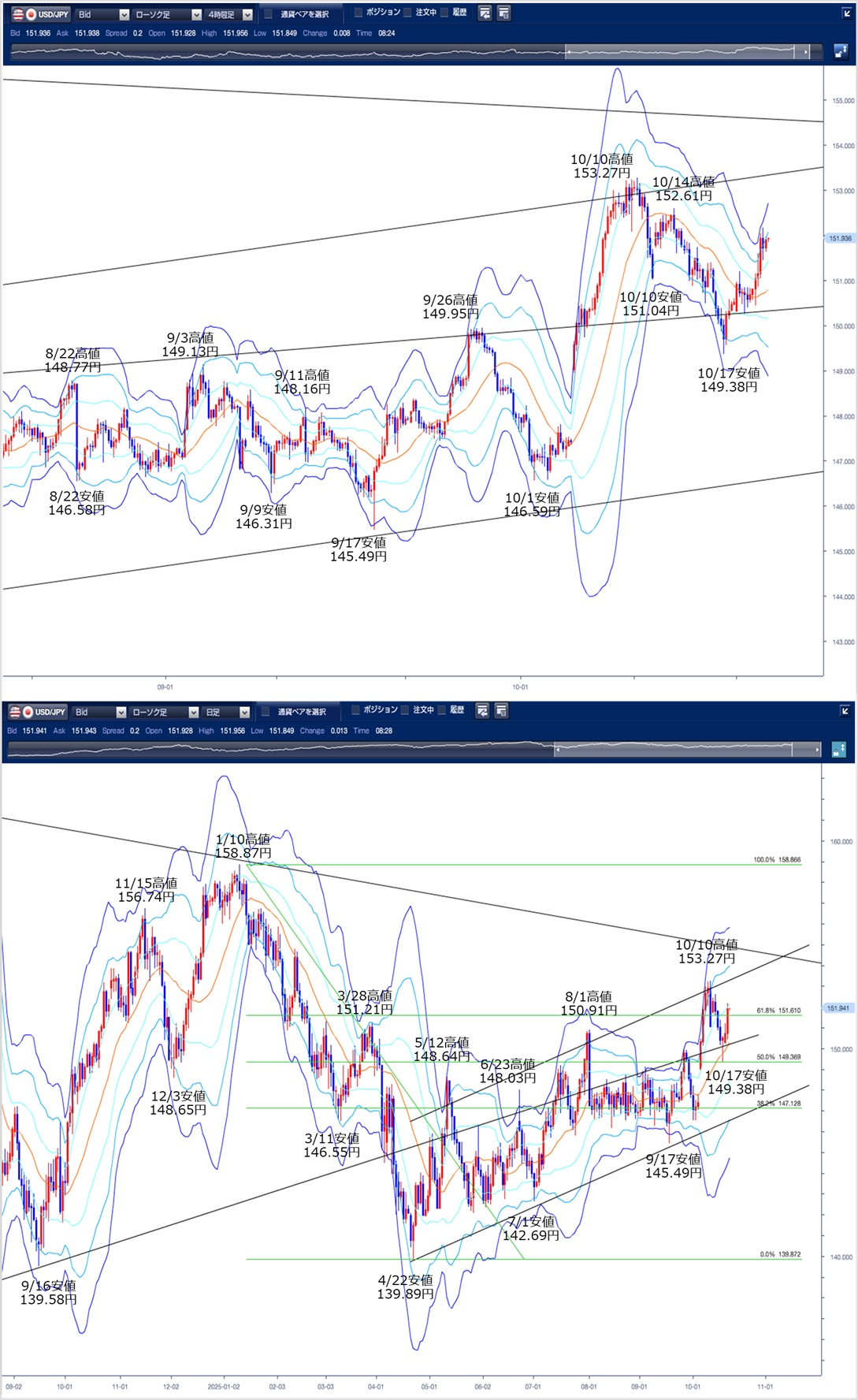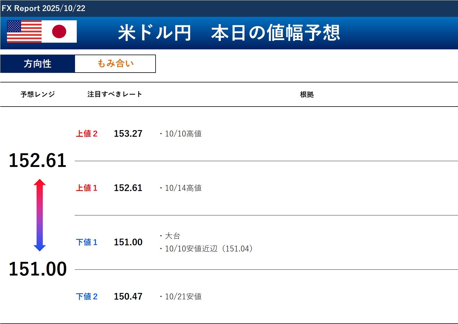 昨日(10月21日)のドル円は、3日続伸。 積極財政や金融緩和を志向するとされる高市早苗氏が新首相に就任したことを受けて、152.17円まで上昇しました。 東京市場は、上昇。 高市総裁が首相に選出されるとの思惑から、円売りドル買いが優勢となり、151.23円まで上昇。高市氏の首相選出後、日経平均株価が50,000円を手前に下落に転じたことで、150.88円まで下押ししたものの、「日銀は年末までの追加利上げの可能性は排除していないものの、来週会合での利上げを急ぐ必要はない」との一部報道が伝わったことで再びドル買いが優勢となり、151.60円まで上昇しました。 欧州市場は、続伸。 東京市場の流れを引き継ぎ、152.17円まで上値を伸ばしました。 NY市場は下値が堅い。 米10年債利回りが3.94%台まで低下したことで一時151.46円まで下落したものの下値は堅く、151.90円近辺での推移が続きました。 ==========================