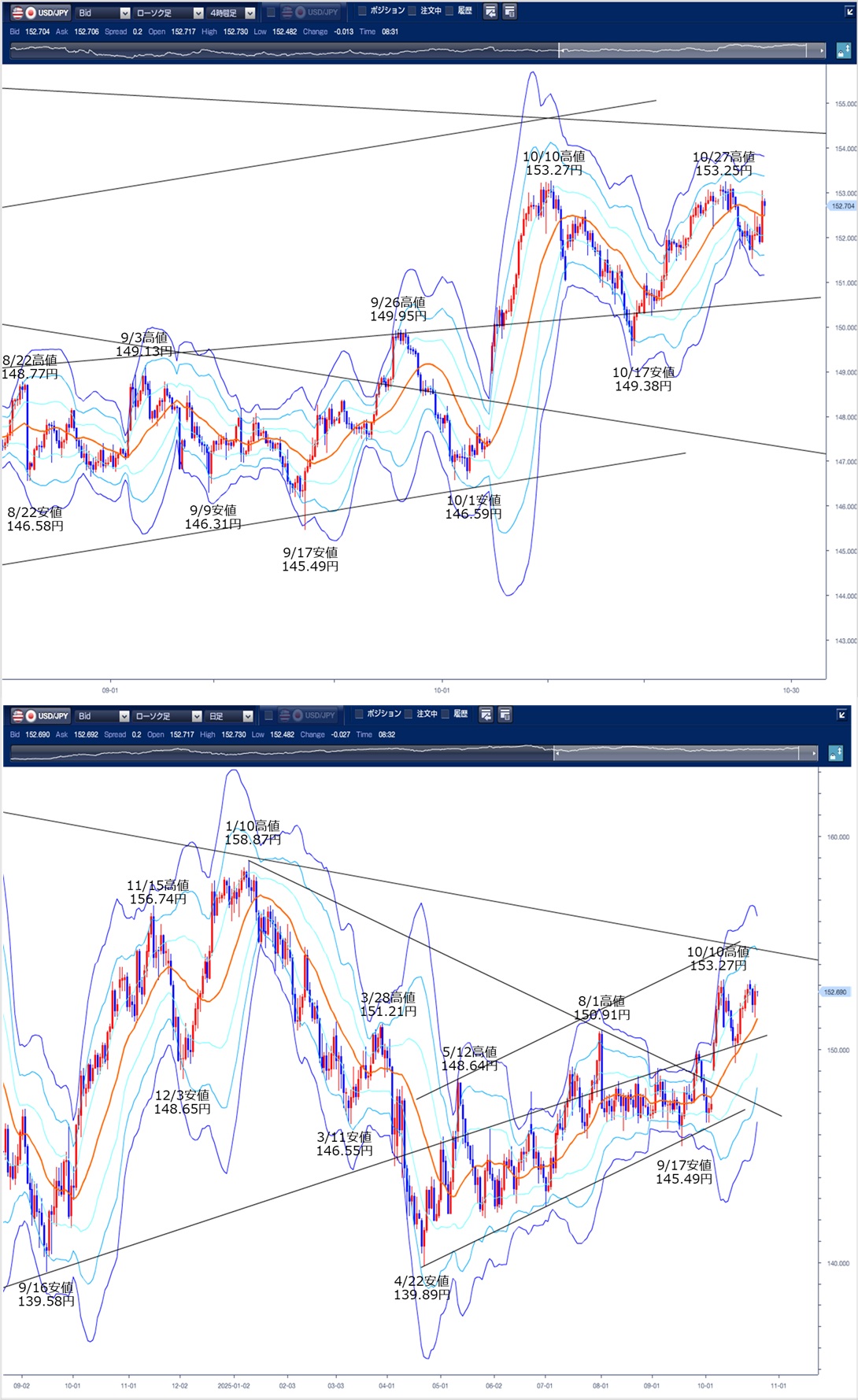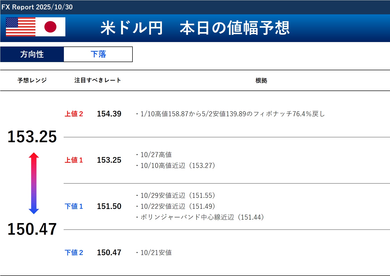 昨日(10月29日)のドル円は、上昇。 FOMCの結果やパウエルFRB議長の発言を受けて、一時153.05円まで上昇しました。 東京市場は下落後に上昇。 早朝に151.55円まで下落したものの、日経平均株価が史上最高値を更新したことや、FOMCを控えたポジション調整の買い戻しなどで、152.54円まで上昇しました。 欧州市場は、もみ合い。 152円台前半で方向感を欠いた値動きとなりました。 NY市場は、上昇。 FOMCでは、市場予想通りとなる0.25%の利下げ(3.75-4.00%)のほか、バランスシートの圧縮(量的引き締め:QT)を12月1日で終了することも決定。 その後、パウエルFRB議長の記者会見で、12月の利下げについて「既定路線というにはほど遠い」などと発言したことで米利下げ継続への期待感が後退し、米長期金利の上昇とともにドル買い円売りが優勢となり、一時153.05円まで上昇しました。 ==========================