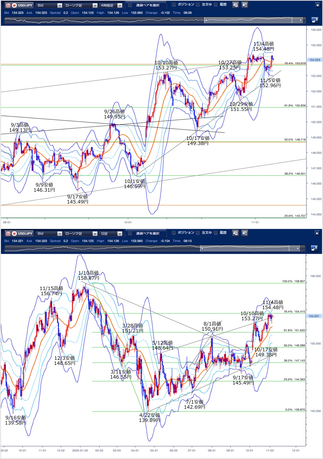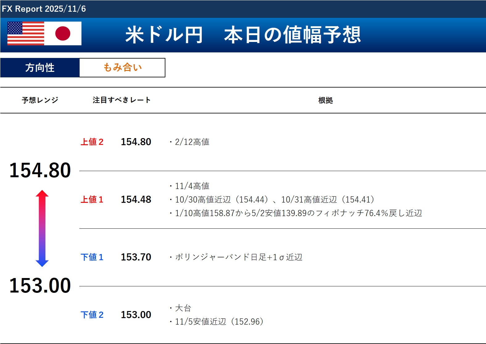 昨日(11月5日)のドル円は、上昇。 米経済指標の予想を上回る強い結果を受け、米10年債利回りの上昇とともにドル買い円売りが優勢となり、154.36円まで上昇しました。 東京市場は、下落後に反発。 日経平均株価が2,400円超の大幅下落となったことを背景にリスク回避のドル売り円買いが優勢となり、152.96円まで下落しました。ただ、その後は日経平均株価が下げ幅を縮小したことでリスク回避姿勢が後退し、153.56円まで値を戻す展開となりました。 欧州市場はもみ合い。 153.42円〜153.83円と41銭幅で方向感を欠いた値動きとなりました。 NY市場は上昇。 10月ADP雇用統計(予想2.8万人 結果4.2万人)、米10月ISM非製造業景況指数(予想50.8 結果52.4)の市場予想を上回る強い結果を受け、米10年債利回りの上昇とともにドル買い円売りが優勢となり、154.36円まで上昇しました。 ただ、前日高値154.48円が意識されると買いも続かず、154.01円まで下落する展開となりました。 ==========================