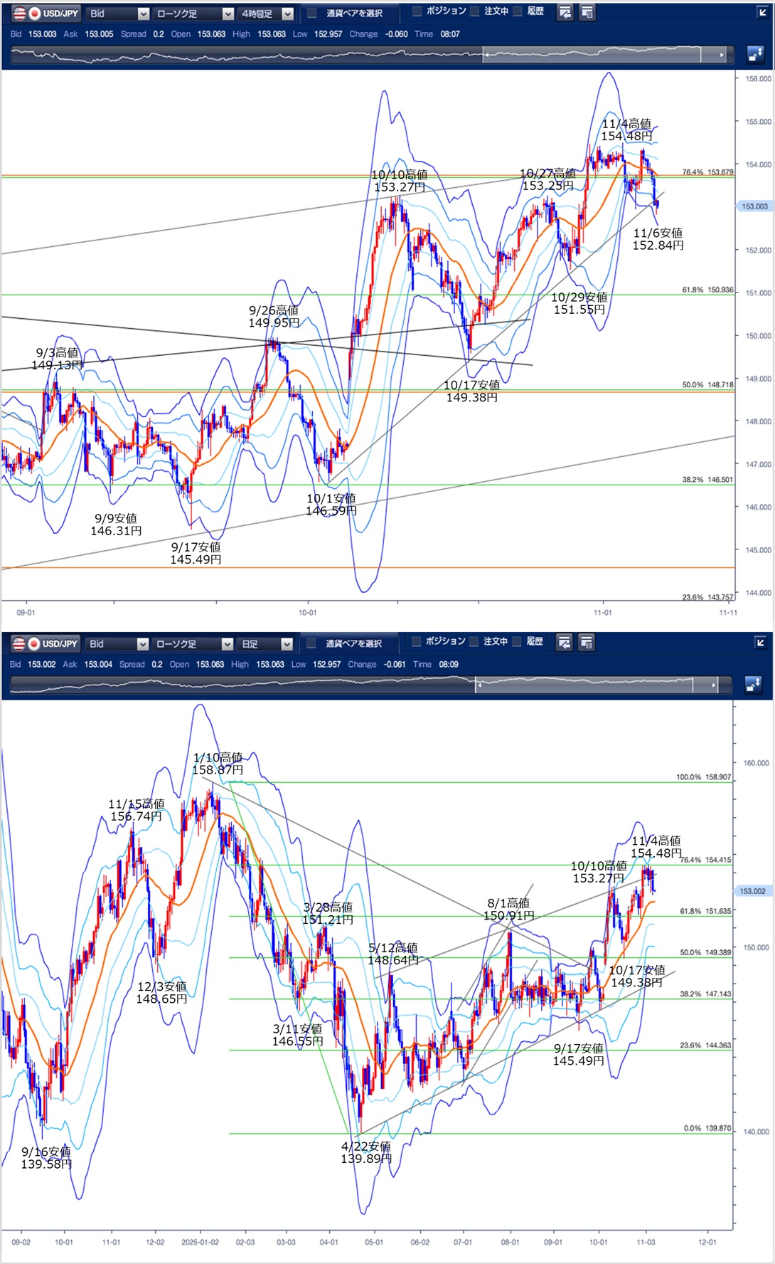 昨日(11月6日)のドル円は、大幅下落。 米雇用関連指標の大幅悪化を受け、米10年債利回りの低下とともに152.84円まで下落しました。 東京市場は上値が重い。 日経平均株価が1000円超上昇したことを背景にドル買い円売りが優勢となり、154.14円まで上昇したものの、その後、日経平均株価が上げ幅を縮小したことで一転、153.80円まで下落しました。 欧州市場は下落。 時間外の米10年債利回りの低下を受け、ドル売り円買いが優勢となり、153.53円まで下落しました。 NY市場は続落。 米10月チャレンジャー人員削減数(前回-25.8% 結果175.3%)が大幅に悪化したことでドル売り円買いが優勢となり、米10年債利回りの低下とともに152.84円まで下落しました。 ==========================