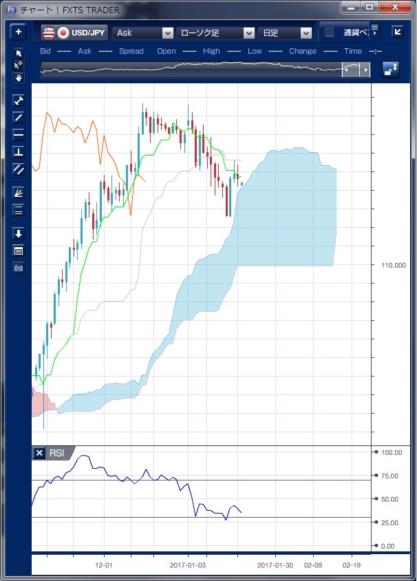 先週のドル/円相場は、トランプ次期大統領が人民元に対してドルが強すぎるとドル高をけん制したことや、次期政権の保護主義的な通商政策は経済に悪影響を及ぼすとの懸念が浮上し、ドルは一時112円57銭まで下落しました。 しかし、イエレン米連邦準備理事会(FRB)議長の講演で「雇用は最大、インフレは2%の目標に近づいている」、「自身やFOMCメンバーは年2、3回の利上げを予想している」と追加利上げに前向きな考えが示されたことを受けてドルは反発し、一時115円62銭まで値を戻しました。 その後、週末に向けては、トランプ新大統領の就任式を控えてポジション調整的な取引が主体となり、114円台で方向感のない取引となりました。 テクニカルで見ると、先週のドル下落で一目均衡表では、転換線が基準線を下抜き、また遅行スパンが陰転していることが確認できます。 昨年末からのトランプ・ラリーが終結したことが示唆されています。 ただし、現状では厚い先行スパンの雲が下値に控えており、これを下抜けるまでは本格的な反転とは言いがたく、また現状水準を維持していけば、来月には再び遅行スパンの要点も考えられ、明確な方向感を決め打ちしにくい形と言えます。 当面は114円台を中心に米新政権の政策を見極めながら、方向性を探る展開が続きそうです。 ※チャートは、ドル/円の日足一目均衡表RSIを表示しています。