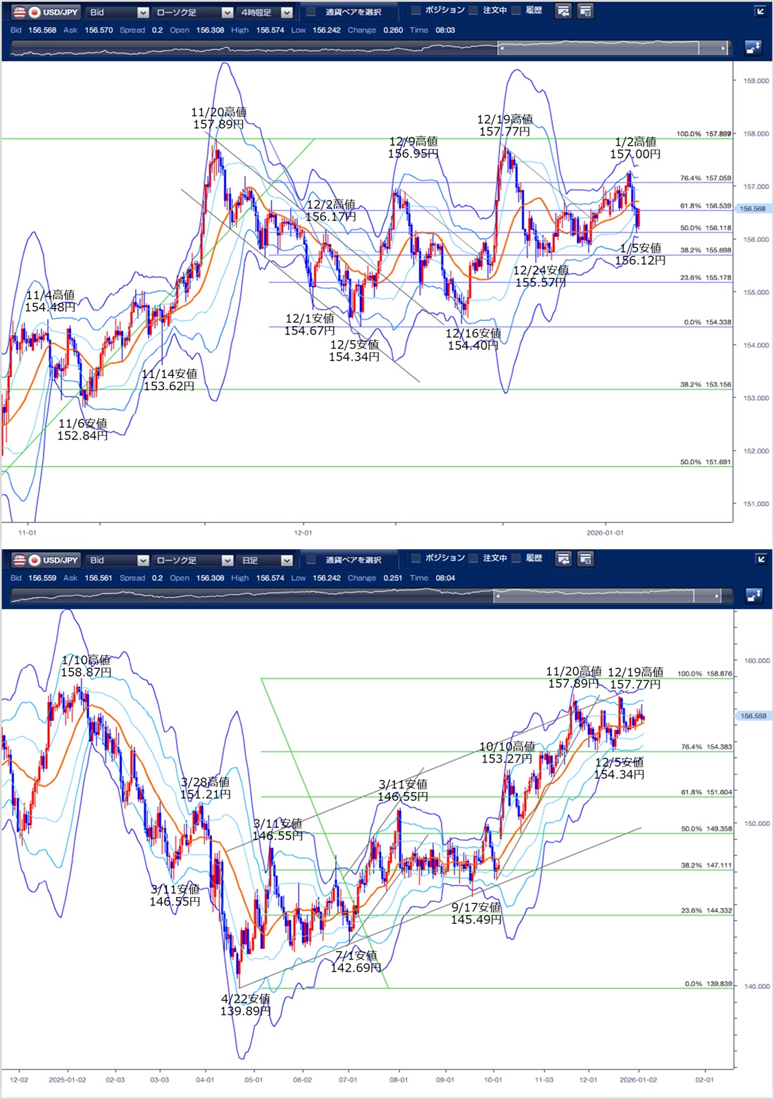 ドル円の前日の為替相場の動きを、各テクニカルで検証します。