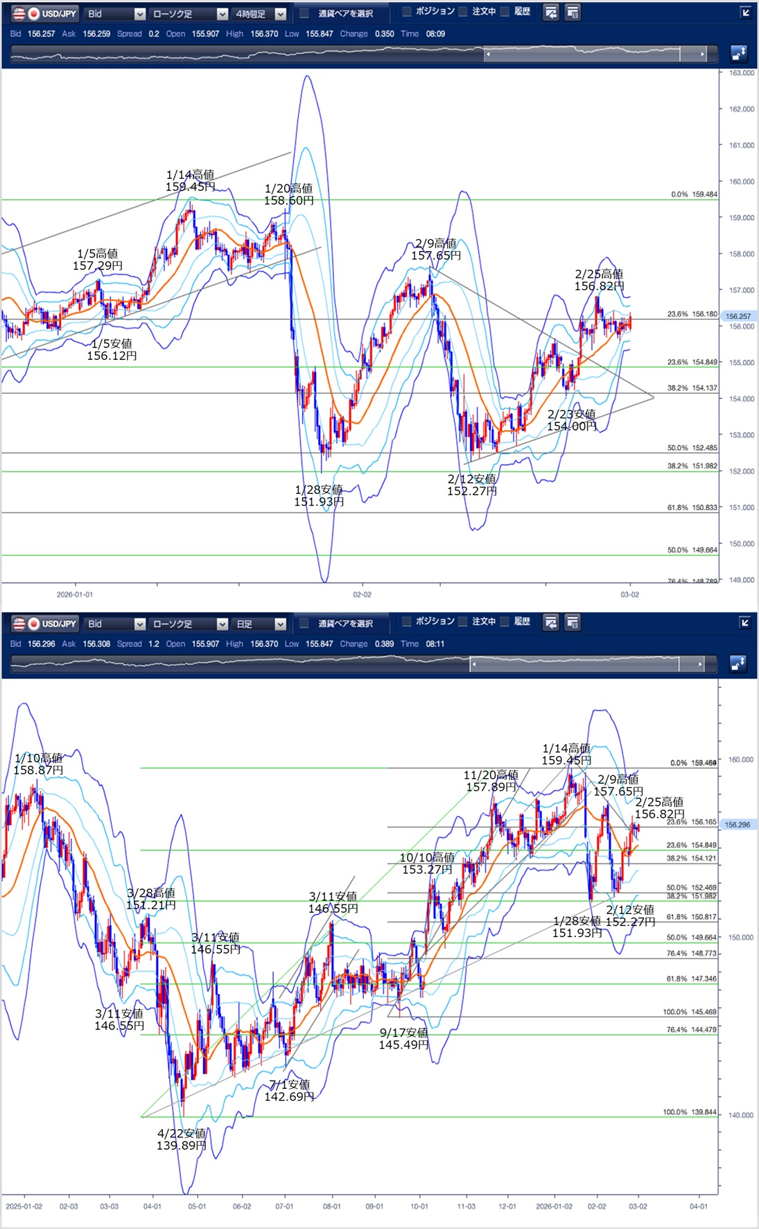 ドル円の前日の為替相場の動きを、各テクニカルで検証します。