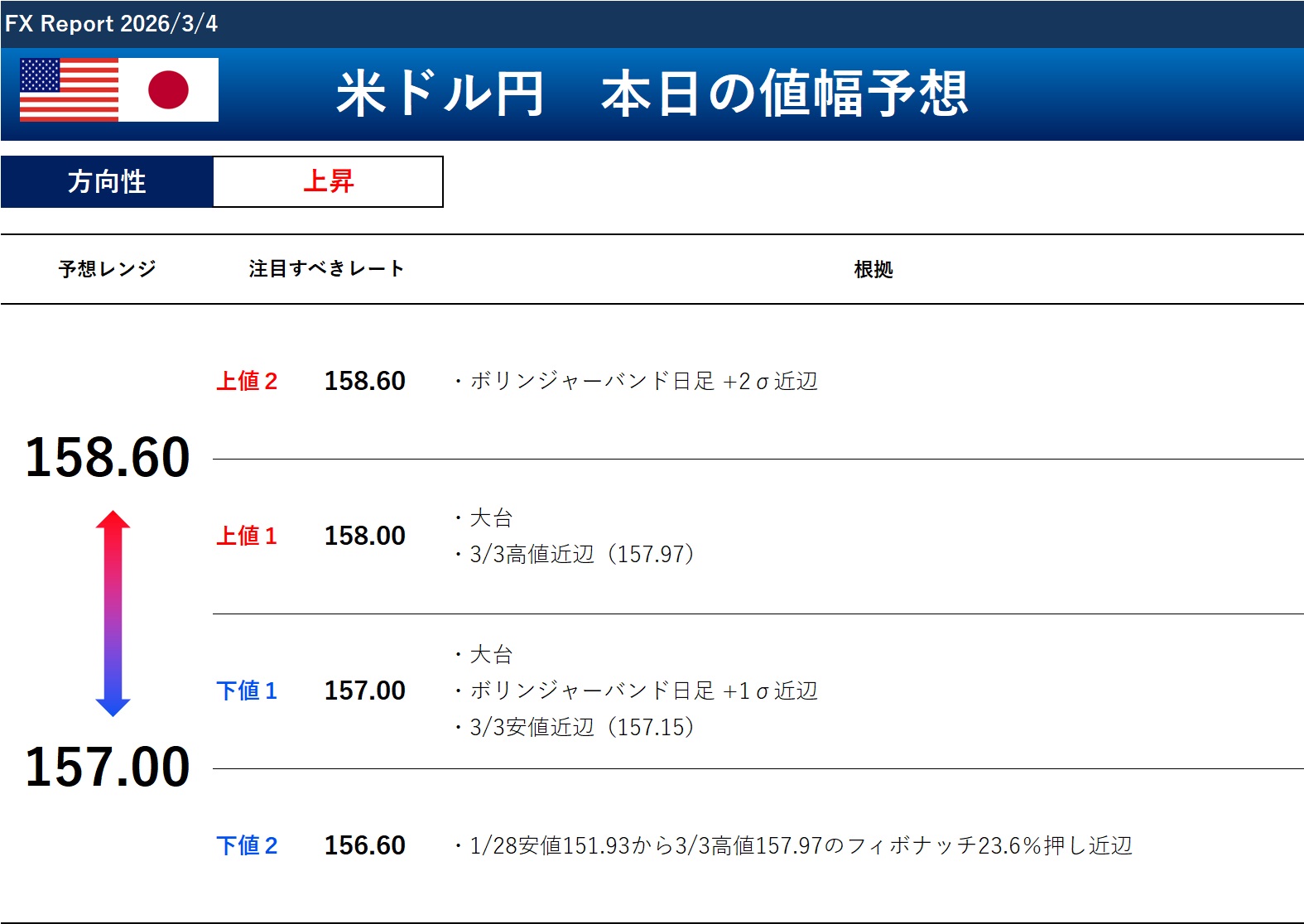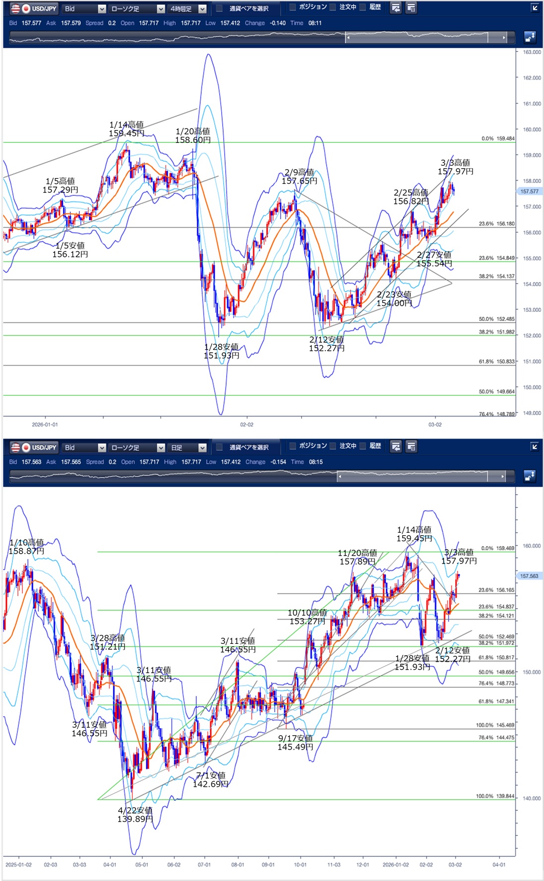 昨日(3月3日)のドル円は、続伸。 中東情勢における地政学的リスクの高まりを受けた「有事のドル買い」は続き、1月23日以来の高値となる157.97円まで上昇しました。 東京市場はもみ合い。 157.18円〜157.59円と41銭幅で方向感を欠いた値動きとなりました。 欧州市場は上昇。 中東情勢における地政学的リスクの高まりを受けた「有事のドル買い」は続き、1月23日以来の高値となる 157.97円まで上昇しました。ただ、158円の大台を前に、政府・日銀による為替介入への警戒感からドル売り円買いが優勢となり、157.68円まで下落しました。 NY市場は上値が重い。 日米でのレートチェックが行われた158円台では、為替介入への警戒感が高まり、注目する経済指標の発表がなく、週末の米国雇用統計を控えたポジション調整の動きもあり、徐々に値を切り下げて157.47円まで下落しました。 ==========================