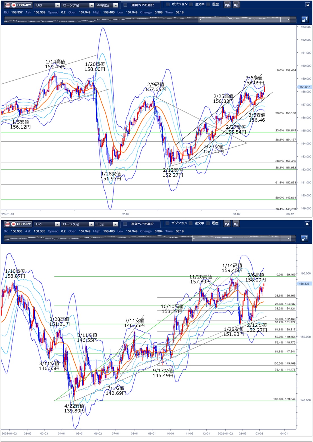ドル円の前日の為替相場の動きを、各テクニカルで検証します。