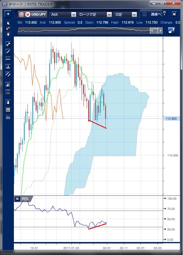 昨日のドル/円相場は、東京から欧州初めの時間までは113円台後半での持合いが続きました。 114円が上値の壁となっているものの、ドルを売り込む材料も無い状況といえました。 しかし、NY時間になると、米国家通商会議(NTC)ナバロ委員長が、ドイツが「ユーロの甚だしい過小評価を悪用して貿易での優位性を高めている」と批判したと一部英紙が報道され、さらにトランプ米大統領が製薬メーカーの経営トップを集めた会合で、「中国と日本が為替を操作して、通貨安を誘導している」と批判したと伝わるとドルが全面安の展開となり、ドル/円も112円08銭の安値をつけました。 テクニカルに見ると、ダブルボトムとなっていた112円台半ばを下抜けており、下値余地が広がっているようにも見えます。 ただし、昨日の下抜けはヒゲだけで終わっているため、実体としてこの水準を下抜けていくかを見極めたいところです。 また、安値は切り下がっているものの、RSIの底はやや切り上かっており、この点でもドルの反発が期待されます。 トランプ政権は各国の通貨安批判を発信しているものの、実際には米国経済の回復と各国の金融政策の結果としてドル高・その他国通貨安が起こっており、批判を繰り返すだけでドル安が実現できるとは思えません。 ただし、ドル/円ではまだドルロング・ポジションが多くあり、投機筋を中心に米政権のけん制発言ごとにポジション整理が出てくる可能性も考えられるため、ドルの上値は重くなってきそうです。 ※チャートは、ドル/円の日足一目均衡表RSIを表示しています。