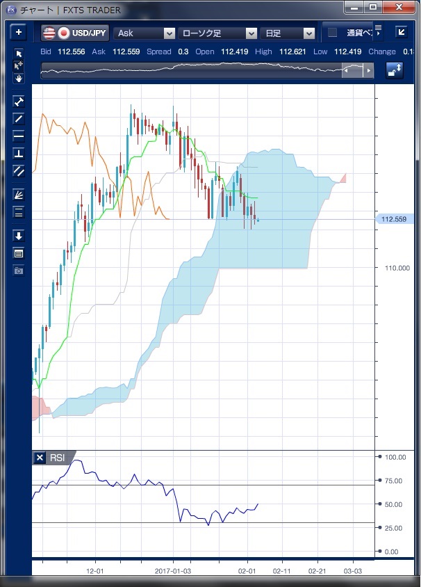 先週のドル/円相場は、週初に115円近辺でスタートしたものの、その後は軟調な動きを続けました。 トランプ政権の為替政策に対する市場の警戒感が高まっていることがドル下落を促す要因となったと指摘されます。 週末の米雇用統計では、非農業部門雇用者数が前月比+22.7万人と市場予想を大幅に上回ったものの、失業率は4.8%に上昇し、平均時間給の伸びは前年比+2.5%(前月比+0.1%)に鈍化しました。 この結果を市場では、「雇用の拡大は続いているものの、平均時間給の上昇率は鈍化した」と解釈し、早期の利上げ観測がやや後退し、ドルも112円台まで下押して週を越えています。 テクニカルで見ると、引き続き一目均衡表ではドル安を示す動きが続いています。 特に今週は、ローソク足と遅行スパンの関係では、ドル安方向への力が強まるように見え注意が必要でしょう。 ただし、相関が逆行した場合は、反応が大きくなることが多く、ドルの急上昇の可能性もありえることは留意しておきたいところです。 直近のボトムであった112円ミドルが下抜けてきており、現在は112円ちょうど水準が下値抵抗となっています。 この水準を今週も支えられるかに注目です。 また、下値が切り下がったものの、RSIは上昇しており、この点からもドルの反発が期待されます。 ※チャートは、ドル/円の日足一目均衡表RSIを表示しています。