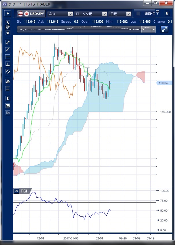 先週のドル/円相場は、日米首脳会談で円安がけん制されるとの懸念やユーロ圏の政治的な先行き不透明感を嫌気したユーロ/円の急落にもつられ、ドルは約 2ヶ月ぶりの安値となる 111 円59銭まで下落しました。 しかし、この水準では下値も堅く、その後は日米首脳会談を控え概ね112円を挟んだ推移が続きました。 週後半では、にトランプ大統領による「向こう数週間以内に、驚くべき税制改革案を発表する」との発言が報じられると、大幅減税への期待感が再燃し、株価が史上最高値を更新し、ドルも 113 円台前半まで急反発しました。 さらに、金曜日のNY時間では日米首脳会談後の記者会見で、為替・貿易に対する対日強硬発言もなく無難なものとなったことで市場の安心感が広がり、113円台後半の水準を維持して週を越えています。 テクニカルで見ると、まだ一目均衡表の先行スパンの雲の中を推移しており、明確な方向性が見えない状況が続いています。 ただし、現状水準を維持できると、来週にかけては遅行スパンが買い転換する可能性が示唆されており、ドルの底打ち期待が高まります。 また、RSIを見ても先週は価格が安値を更新したものの、RSIは切り上げっており反発が期待される形となっています。 今週は、トランプ政権による大規模減税などの税制改革への期待から、ドル買いが継続することが予想されるものの、その政策の内容次第の面もあり、結局はトランプ大統領に市場が振り回される展開がまだしばらく続くといえそうです。 ※チャートは、ドル/円の日足一目均衡表RSIを表示しています。