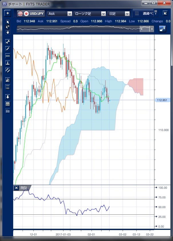 先週のドル/円相場は、14、15日に行われたイエレン米連邦準備理事会(FRB)議長の議会証言で「利上げを過剰に長く待つことは賢明ではない」との見解が示され、また「財政政策の変更は金利見通しに影響する可能性もある」と指摘したことを受け、トランプ政権の税制改革が景気加速を促し場合、利上げペースは速まる可能性があるとの見方が広がりました。 また、15日に発表された1月米消費者物価指数(CPI)と1月米小売売上高が予想を上回ったことで、ドルは一時114円96銭まで上昇しました。 しかし、節目の115円を抜け切ることができなかったことで利食いのドル売りが強まり、また欧州の政治不安に対する市場の警戒感の再燃もあって、週末には112円台半ばまで押し戻される動きとなりました。 テクニカルで見ると、遅行スパンがローソク足の動きに引きずられ同調しています。 この動きが続くのであれば、今週も112円〜115円水準での方向感のない動きとなりそうです。 ただし、一気に上抜けると、逆行の動きとなり急騰リスクがあることには注意が必要です。 また、RSIが切り上げってきていることから、ドルの下値は底堅く推移するかもしれません。 ※チャートは、ドル/円の日足一目均衡表RSIを表示しています。