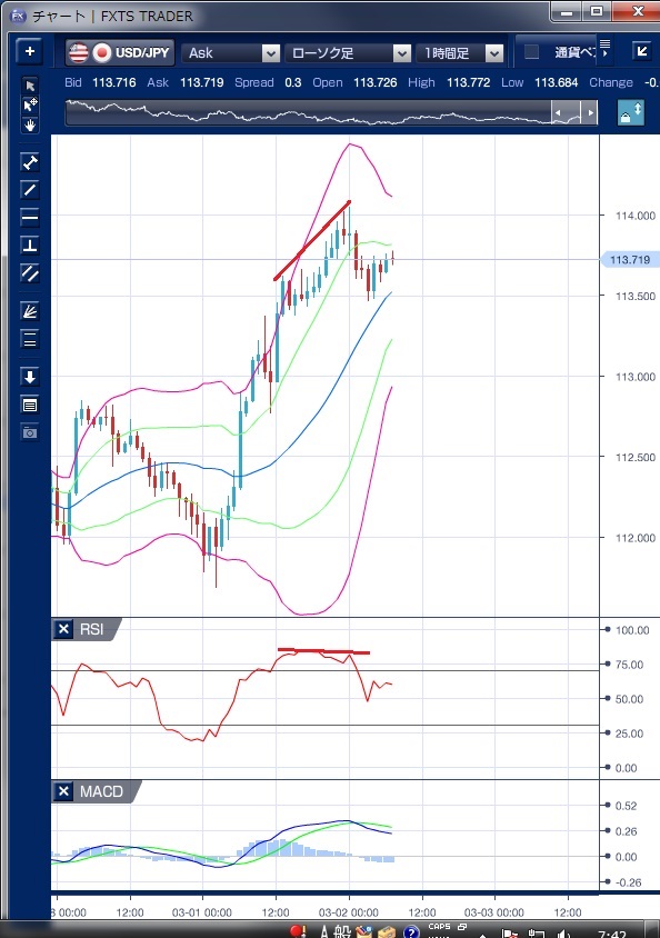 昨日のドル/円相場は、午前11時から始まったトランプ米大統領の議会演説でインフラ投資に ついて具体的なものが出なかったとの不満から一時112円77銭まで下押しする局面もありましたが、その後は海外での反応を見たいという動きが強まりドルは買い戻される展開となりました。 海外市場では、選挙中からの公約実施を再確認したとの評価が優勢で期待感が再燃し、ドルは底堅い動きを続け、NY時間に入ると2月米ISM製造業景況指数が2014年8月来で最高となったことや、米地区連銀経済報告(ベージュブック)でも経済や雇用の拡大継続が確認されたことで、3月利上げ観測を受けたドル買いで一時114円05銭まで上昇しました。 もっとも、海外市場での上昇では、ボリンジャーバンドのアッパーバンドにタッチできず、また価格の上昇にもかかわらずRSIは横ばいとなっており、ドルの一段の上昇には疑問が残る形となっています。 また、その後にMACDも売り転換しており、114円台以上ではドルの重さを感じさせる形状といえそうです。 3月FOMCでの利上げ期待が強まっているものの、高値警戒感も強く上値追いの勢いも感じられないことから、本日も113円台を中心とした方向感のない動きが続きそうです。 ※チャートは、ドル/円の1時間足ボリンジャーバンドRSIMACDを表示しています。