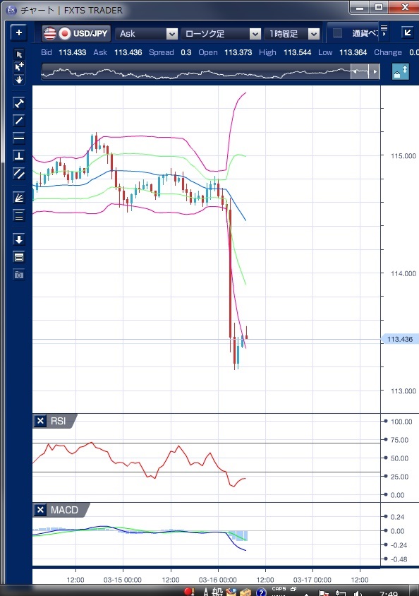 昨日のドル/円相場は、東京時間から欧州時間にかけては、米FOMC待ちの様子見姿勢が強く114円台後半での方向感のない小動きが続きました。 テクニカルで見ても、ボリンジャーバンドが縮小し、相場の動きがその範囲内となっていることやMACDとシグナルともにゼロ水準で交錯していることから、方向感なく動きにくい状況が示されています。 注目のFOMCでは、市場の予想通りFFレートの誘導目標が25bp引き上げられ0.75〜1.00%となったものの、全会一致ではなく、金利据え置きを主張した反対票が1票投じられたことや、一部で期待されていたドットプロットでの利上げ回数見込の上方修正が見送られたことなどを受け、米債利回りが急低下し、ドルも大きく売られ、ドル/円は一時113円18銭まで下落しました。 この下落で、相場はボリンジャーバンドを一気にした抜き、MACDも大きく下落しました。 ただし、昨年12月の利上げ時に比べれば、FRBイエレン議長の米経済に対する見方はより強気なったと感じられ、今回のドル急落は、一部投機筋の利上げペースに関する行き過ぎた期待が剥落したためと考えられ、一段の下値追いの可能性は低いように思われます。 ※チャートは、ドル/円の1時間足ボリンジャーバンドRSIMACDを表示しています。