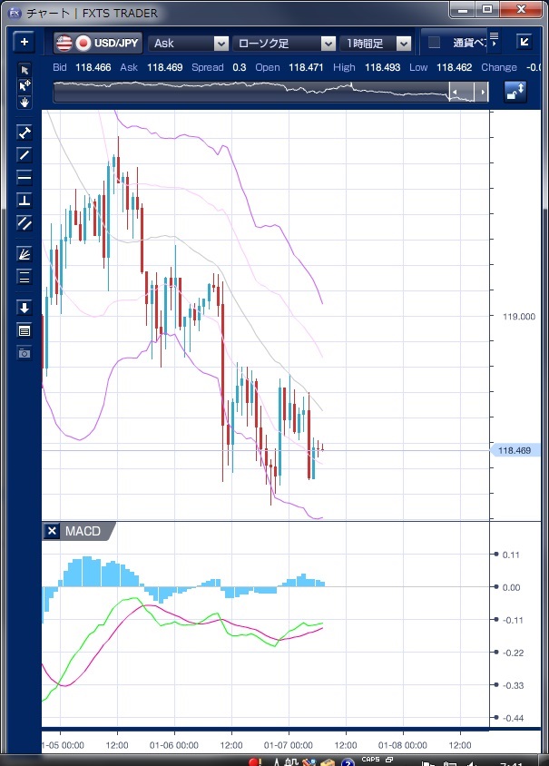 チャートは、ドル/円の1時間足ボリンジャーバンドMACDを表示しています。 昨日のドル/円相場は、東京時間朝方は日経平均株価の反発をにらみながら底堅い動きで始まりました。 その後、中国人民銀行が人民元の対ドル基準値を1ドル=6.5314元と元安方向に設定したことを受けて、リスク回避のムードが強まり、ドル/円は軟化し、118円台前半をつけました。 さらに北朝鮮が水爆実験を実施したことが伝わると、ドル売り圧力が強まりましたが、下値は限定的でその後はドルの戻りが見られる動きとなりました。 NY時間に入ると、フィッシャー米FRB副議長「市場の金利見通しは低過ぎ」とタカ派の発言をしたこと、米12月ADP全米雇用報告で雇用者数が予想外に増加したことや11月貿易赤字も予想以上に縮小したことを受けてドル売りがいったん後退し、118円後半まで値を戻す展開となりました。 もっとも、118円後半では上値は重く、118円半ば水準まで押し戻されてNYを引けています。 テクニカルで見ると、119円割れ後のストップを巻き込んだ下落で大きく下げており、ボリンジャーバンドを下抜けましたが、バンドウォークには繋がらなかったことが確認できます。 上下ともにバンドが下向きになっていることからドル軟調地合と受け取れますが、下落の勢いは強くないように見えます。 MACDを見ても、マイナス圏にあることからドルは下方向を向いていると思われるものの、シグナルとは交錯しながら動きていることから、目先では118円を割れて一段と下落が加速するのは難しいものと思われます。