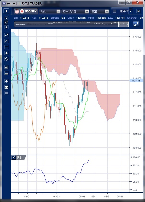 先週のドル/円相場は、日本がGWの連休中、米連邦予算の成立などを好感してリスクオンによるドルの買い戻しが進みました。 ドル/円は4日のNY時間で一時3月17日以来となる113円04銭まで上昇しました。 週末の米雇用統計は、非農業部門雇用者数が21.1万人増と市場予想を上回ったものの、前月分が下方修正されました。 失業率は4.4%と市場予想に反し前月から低下しました。 平均時給は前年比2.5%増と市場予想を下回り、前月分も下方修正されています。 単純に反応しにくい内容に、発表後、市場は上下に降らされましたが、均してみれば雇用拡大ペースは維持されており、失業率は低下を継続しており、賃金の伸びは鈍化したものの、FRBの追加利上げを阻む内容ではないとの判断が優勢で、ドルは底堅い動きで週を越えています。 一目均衡表を見ると、先週のドル上昇で遅行スパンがローソク足を上抜き買い転換し、転換線も基準線を上回ってきています。 相場が先行スパンの雲を上抜けることが出来れば、三役好転となりますが、週明けの市場ではすでに雲を上抜きつつあり、週初からドル上昇基調の確認となる可能性も出ています。 ただし、RSIが90を越えてきており買われ過ぎ水準にあるため、短期調整の可能性には留意しておく必要があるでしょう。 ※チャートは、ドル/円の日足一目均衡表RSIを表示しています。