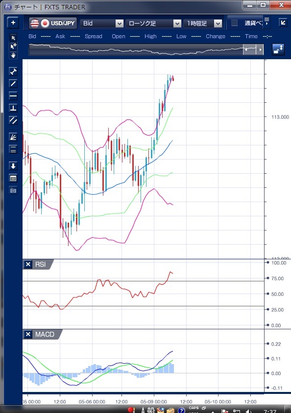 昨日のドル/円相場は、東京朝方はフランス大統領選でマクロン氏が当選したことを受けドルが堅調な動きでスタートしました。 しかし、113円台では利食いのドル売りも持ち込まれ、その後は112円台後半での小動きが続きました。 欧州時間に入ると、特に材料のないなかドルは軟化し、112円40銭の安値をつけました。 その後、ドルは切り返し徐々に値を上げ、NY時間に入るとセントルイス連銀のブラード総裁が講演で「現在の政策金利の設定は適切であり、政策金利は低い状態にある」と発言したことやクリーブランド連銀のメスター総裁が年内のバランスシート縮小に言及したことなどを受けドル買いに拍車がかかり、113円30銭まで一本調子でのドル上昇となりました。 テクニカルで見ると、NY時間スタート時にすでにMACDが買い転換しており、その後のドル上昇を示唆していることがわかります。 また、NY時間の上昇ではボリンジャーバンドを上抜けバンドウォークの発生が確認できます。 ただし、RSIが90を越えてきており、短期的には買われすぎにあることを示しており、調整のリスクは意識しておきたいところです。 ※チャートは、ドル/円の1時間足ボリンジャーバンドRSIMACDを表示しています。