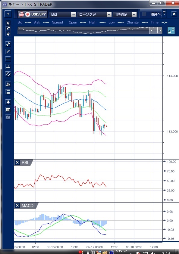 昨日のドル/円相場は、113円台で方向感のない取引が続きました。 特に東京時間では、113円台半ばを中心として、日経平均の動きをにらみながら小動きの展開となりました。 欧州参入時に、下押しが強くなりボリンジャーバンドを下抜けたものの、バンドが抵抗線となり、113円台半ばまで押し戻される動きとなっています。 その後、NY時間に入ると4月の米住宅着工件数が117.2万戸と市場予想を下回り、昨年9月以来の低水準となったことを受けてドル売りが強まり、一時113円割れまで下落しました。 また、米メディアがトランプ米大統領の情報漏えい疑惑を追及していることも、ドルの重石になったとの指摘もあります。 この下落でもボリンジャーバンドを下抜けたものの、バンドウォークには繋がらず明確な方向感がないことが示唆されています。 ドルは、上値の重さが意識される動きとなっていますが、112円台半ばでのドル買い意欲も強く、本日も一方向への動きが期待しにくい相場となりそうです。 ※チャートは、ドル/円の1時間足ボリンジャーバンドRSIMACDを表示しています。