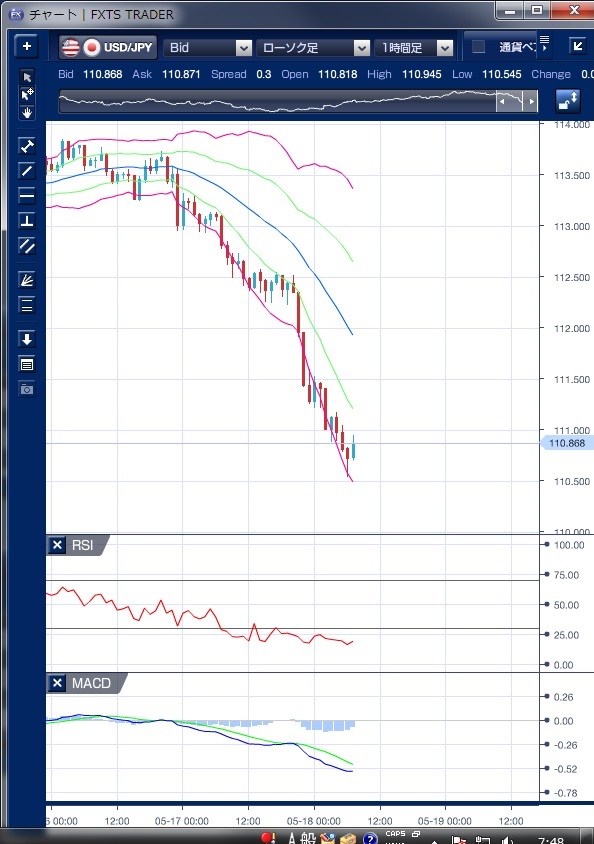 昨日のドル/円相場は、113円台から110円台へと急落の展開となりました。 東京朝方の113円を割り込むと、じりじりと112円台半ばまで下押しました。 ただし、その後欧州時間午前までは112円台半ばで方向感のない小動きが続きました。 NY時間に入ると、ロシアの米大統領選関与疑惑を巡りトランプ大統領に対する弾劾裁判の可能性が持ち上がったことなどを受けて、ドルが全面安となり、特に対円ではリスク回避の思惑で112円半ばから111円割れの急落となりました。 トランプ米大統領がロシアに機密情報を漏えいとの報道に続いて、大統領が解任したコミ―前連邦捜査局(FBI)長官の在任中に、フリン前大統領補佐官とロシアの関係を巡る捜査を打ち切るよう要請し捜査を妨害しようとしたとの疑いが浮上しており、大統領罷免などの可能性まで取り沙汰され始めています。 NY時間は一貫してドル下落基調が続きましたが、RSIを見ると低位に張り付いており、短期的には売られ過ぎ水準といえるため、目先の反発の可能性が考えられます。 もっとも、トランプ政権の先行き懸念を一気に払しょくするようなニュースが報じられると期待することは難しく、ドルの戻りも限られたものとなりそうです。 ※チャートは、ドル/円の1時間足ボリンジャーバンドRSIMACDを表示しています。