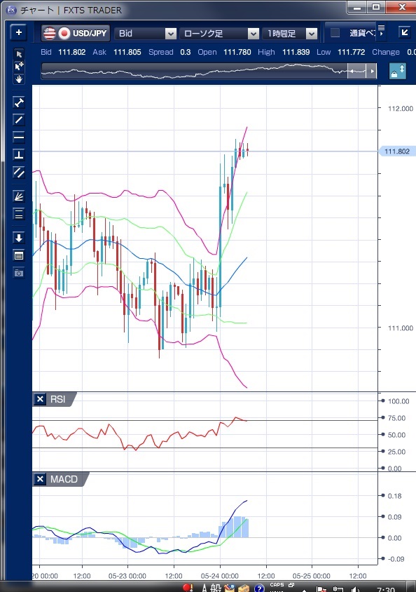 昨日のドル/円相場は、東京朝方は「トランプ大統領が今年3月、コーツ国家情報長官などに対し、昨年の大統領選でトランプ陣営がロシアと共謀したことを示すいかなる証拠も公に否定するよう要請していた」と一部報道で伝えられたことを受けて軟調に推移し、一時110円86銭まで下落しました。 しかし、その後は111円を挟んだ小動きに終始し、欧州時間に入っても111円台前半での揉み合いが続きました。 NY時間に入ると、4月の米新築住宅販売件数が56.9万戸と市場予想を下回り、同時に発表された5月の米リッチモンド連銀製造業指数も+1と市場予想を大きく下回り、昨年10月以来の低水準となったことなどを嫌気し、111円を割り込む局面があったものの、相場への影響は限定的でした。 その後、トランプ政権が2018会計年度の予算を発表したことや、連邦公開市場委員会(FOMC)の議事録公表を控えて、債券利回りが上昇し、ドル/円も急上昇となり111円86銭の高値をつけました。 この上昇で、ボリンジャーバンドの上抜けとバンドウォークが形成されたことが確認できます。 先週後半から、何度か110円台を売り込んだものの跳ね返されたこともあり、ドルの反発は自立的なものともいえます。 米国の6月利上げはかなり織り込まれており、FOMC議事録公表を受けてのドルの上値は限られたものとなる可能性が高いように思われます。 ※チャートは、ドル/円の1時間足ボリンジャーバンドRSIMACDを表示しています。