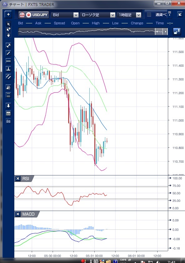 昨日のドル/円相場は、東京朝方は111円台前半で小動きとなっていたものの、じりじりとドルが軟化し、一時110円77銭まで下落しました。 ユーロ/円やポンド/円などクロス円の下落に連れ安となったとの指摘もあります。 この下落で、ボリンジャーバンドの下抜けとバンドウォークが形成されていることが確認できます。 ただし、ドルの下値も堅く、バンドウォークも短期で終了してしまっています。 その後、欧州時間では特に材料の無いなか、ドルの買戻しが優勢となり、NY時間始めでは米経済指標を好感したドル買いに111円25銭まで値を戻しました。 しかし、その後は、米株安やコモディティ価格の下落などを嫌気し、リスク・オフの流れが強まり、ドルは約2週間ぶりの110円67銭まで下落しました。 ただし、価格は東京時間の安値を下回ったものの、RSIは切り上がっておりダイバージェンスを形成していることから、短期のドル反発の可能性が示唆されています。 また、MACDを見てもNY引けにかけて買い転換しています。 もっとも、米国債利回りが低下しており、ロシアゲート疑惑懸念も燻っていることから、ドルの戻りも限定的で、リスクは下方向である流れには変化が無いと思われます。 ※チャートは、ドル/円の1時間足ボリンジャーバンドRSIMACDを表示しています。