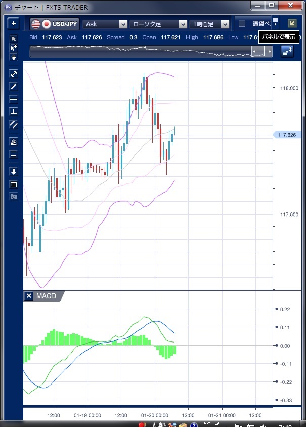 チャートは、ドル/円の1時間足ボリンジャーバンドMACDを表示しています。 昨日のドル/円相場は、朝方は中国の経済指標の発表待ちのムードが続きました。 発表された中国経済指標は、ほぼ市場の予想通りの結果となったため、発表直後は方向感を欠く動きとなりましたが、その後日経平均が値を下げると、それにつられる形で円買いが進み一時117円前半まで値を下げました。 しかし、東京午後に上海総合株価指数が一時3%以上の上げとなったほか、日経平均もプラス圏に反発すると、ドル/円も値を戻す動きとなりました。 黒田東彦日銀総裁が、2%の物価安定目標達成に必要なら金融政策を調整すると述べたことも、追加緩和の可能性を残しているとして下支えになったとの指摘もあります。 欧州時間に入って戻る反発の流れは続き、118円12銭まで上昇する局面もありました。 東京午後からのドル反発局面をテクニカルで見ると、ボリンジャーバンドを上抜け、アッパーバンドに絡みながら動いているものの、ロアーバンドに明白な拡大が見られず、バンドウォークに繋がっていないことから、このドル上昇に強い勢いを感じられません。 ただし、MACDが買いサインを続けていることは、ドルの上昇を支援するものとなっています。 NY時間に入ると、原油価格の続落を受け、リスク回避の流れが強まり、ドルは117円31銭まで下落しました。 この下落の動きで、MACDは売り転換しており、目先118円台が重いことを確認した形となっています。 ただし、NY引けにかけては117円ミドル水準を回復しており、下値についても117円前半が堅くなってきているとの指摘もありました。