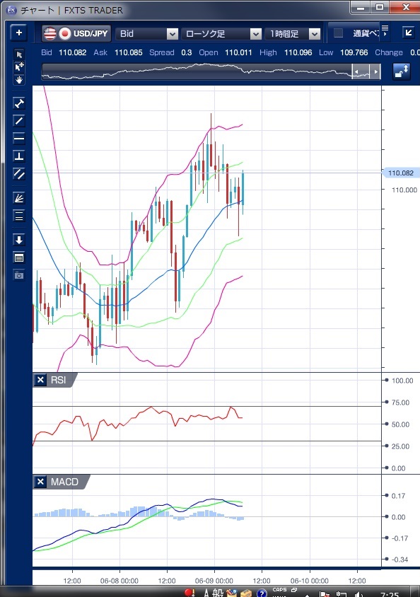昨日のドル/円相場は、東京時間朝方にドル買い先行となり110円を回復する局面もありましたが、その後日銀が金融緩和策を解除するとの観測が市場に広がり109円38戦まで下落しました。 しかし、欧州時間に入ると東京時間のドル売りの中心だった海外短期筋のドル買戻しが優勢となり、再び110円台を回復しました。 さらにNY時間に入ると新規失業保険申請件数が予想を下回ったことや、コミー前FBI長官の上院情報特別委員会公開証言の終了で警戒感が後退したことでドル買い圧力が強まり、110円38銭の高値をつけました。 この上昇で、ボリンジャーバンドを上抜けたもののバンドウォークには繋がらず一過性の動きにとどまっています。 また、価格は東京時間の高値を抜けましたが、RSIは上昇せず、ダイバージェンスを示していました。 NY引けにかけては、英総選挙の出口調査の結果で与党・保守党の過半数割れが伝えられたことからドルは110円台を割り込む動きとなりました。 本日は、イベントを無事通過した後の週末ということもあり、110円を挟んで明確な方向性のない動きが続きそうです。 ※チャートは、ドル/円の1時間足ボリンジャーバンドRSIMACDを表示しています。