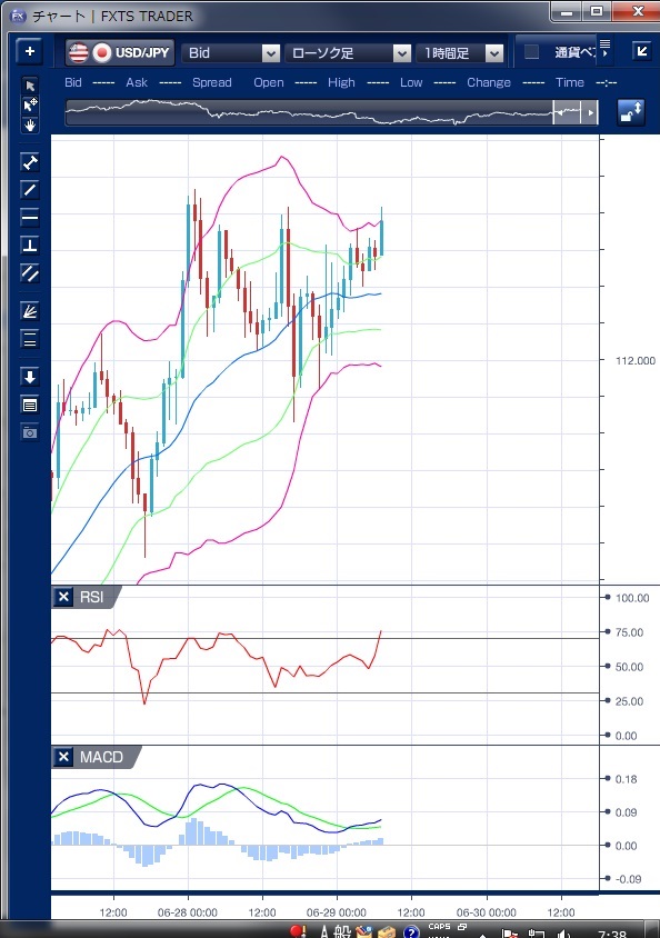 昨日のドル/円相場は、東京時間は112円台前半で、やや上値の重い動きとなりました。 ただし、112円を割れることなく、値動きは小幅にとどまりました。 MACDを見ると、東京朝方には売り転換しており、東京時間のドルの重さを裏付ける形となっています。 欧州時間に入り、一時的にドルが買われたものの、すぐに反落111円80銭水準まで下押しました。 もっとも、この下押しも一過性のものとなり、すぐに112円台を回復しています。 NY時間では、5月の米中古住宅販売成約が予想外の減少を記録し、一時ドル売りが優勢で112円われの局面もありましたが、その後、英欧金利の上昇などを背景にした米債利回り上昇に伴うドル買いが再燃し、112円36銭まで値を上げています。 NY時間には、MACDが再び買い転換しており、本日も112円台でドルの底堅い動きが続きそうです。 ※チャートは、ドル/円の1時間足ボリンジャーバンドRSIMACDを表示しています。