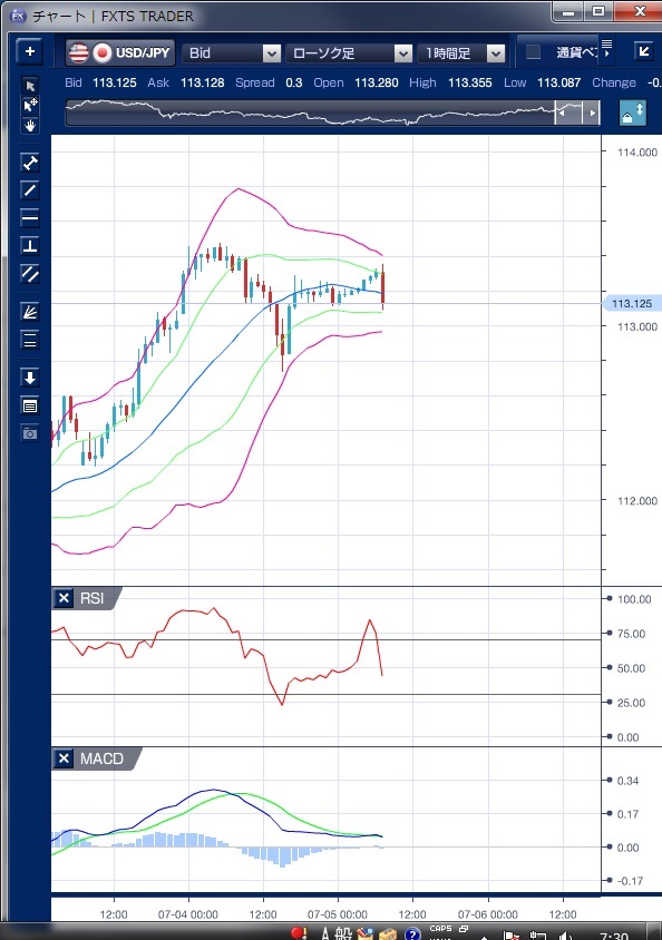 昨日のドル/円相場は、東京時間午前に北朝鮮によるミサイル発射の報道があったものの、相場への影響は限定的で113円台前半で模様眺めムードの強い動きが続きました。 東京午後に入り、午後3時半に北朝鮮が重大発表を行うというニュースが伝わると、リスク回避的な円買いが一時的に強まり、112円74銭まで下落しました。 北朝鮮の発表が、新型ICBMの発射に成功したとの声明であったことで、北朝鮮による武力攻撃懸念が後退したことを受けドル/円は買戻しの動きとなり、再び113円台前半での取引となりました。 その後は、ニューヨーク市場が、独立記念日の祝日で休場のため、主要通貨の取引は動意薄の状態が続き、ドル/円も113円12銭から113円29銭の狭いレンジの中での動きが続きました。 本日も東京時間では材料何の小動きが予想され、今後の動きを考えるには、週末の米雇用統計を含めた米国の経済指標を見極める必要があるでしょう。 ※チャートは、ドル/円の1時間足ボリンジャーバンドRSIMACDを表示しています。