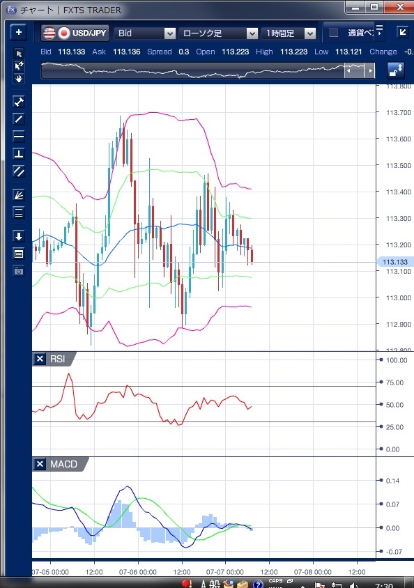 昨日のドル/円相場は、東京時間では、一時113円を割り込む局面もありましたが、基本的には113円台前半で方向感のない動きが続きました。 113円割れの局面でも、ボリンジャーバンドを下抜けることは出来ず、相場に一方向の勢いは感じられない状況といえます。 欧州時間では、113円47銭まで上昇したものの、この上昇でもボリンジャーバンドにタッチできず、膠着が続いています。 NY時間では、米国の6月ADP雇用統計が予想を下回ったため追加利上げに不透明感が広がり、主要通貨に対しドル売りが優勢となりましたが、ドル/円への影響は限定的で、下値も113円03銭にとどまりました。 本日の米雇用統計を見極めるまでは、動きにくい相場が続きそうです。 ※チャートは、ドル/円の1時間足ボリンジャーバンドRSIMACDを表示しています。