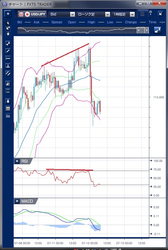 昨日のドル/円相場は、東京時間午前中は、114円10銭〜20銭での方向感の無い取引となりましたが、午後になると、まとまったクロス円の売りが持ち込まれるなど徐々に円売りが強まり3月15日以来の高値である114円46銭まで上昇しました。 MACDを見ると東京午前には買い転換しており、午後の上昇を示唆する形となっていました。 また、この上昇でボリンジャーバンドの上抜けと小さなバンドウォークが形成されています。 しかし、価格の上昇にもかかわらずRSIは上昇せずにダイバージェンスとなっており、ドルの反落リスクを示していました。 欧州時間に入ると、ドル上昇の勢いは弱まり114円台前半に反落しました。 NY時間に入ると、再びドル買いが強まり114円49銭の高値をつけましたが、その後ブレイナード米連邦準備制度理事会(FRB)理事が追加利上げに慎重な見通しを示したほか、トランプ大統領の長男が公開したメールの中でロシア高官が当時の米大統領選・民主党候補だったクリントン氏に不利な情報の提供を申し出たことを示唆していたことでトランプ政権への警戒感が高まりドル売りが加速、一気に113円72銭まで反落する展開となりました。 ただし、MACDを見ると、この反落に先駆けて売り転換しており、こういったニュースが出なくてもドルの高値警戒感は強まっていたと思われます。 ブレイナード理事の発言で9月の追加利上げ期待は後退し、米景気の先行きの不透明感が残っていることから、目先114円台ではドルの上値の重さを感じさせる動きとなりそうです。 ※チャートは、ドル/円の1時間足ボリンジャーバンドRSIMACDを表示しています。