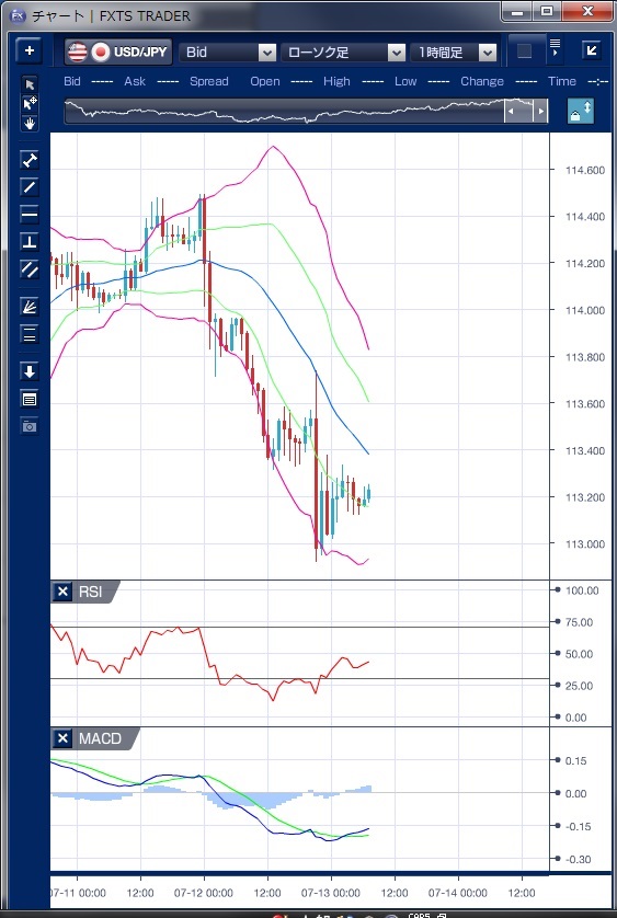 昨日のドル/円相場は、東京時間では前日のトランプ米大統領の長男が、昨年の米大統領選中にロシア人弁護士と会合したとされる問題を巡り、一連の電子メールを公開したことで、ロシアゲート疑惑再燃への警戒感が出たことによるドル安の流れを引き継ぎ、じりじりとドルが軟化する動きとなりました。 朝方の113円97銭を高値に113円30銭水準まで値を下げています。 この間、ボリンジャーバンドに絡みながら下落しているものの、アッパーバンドは緩やかな拡大にとどまっており、弱いバンドウォークといえます。 欧州時間では、イエレン米FRB議長の議会証言を控えて113円前半での模様眺めの動きが続きました。 NY時間でのイエレンFRB議長の議会証言では、米経済は緩やかな利上げとバランスシート縮小を吸収できるほど十分健全だとの認識を示したものの、低水準のインフレ率や自然利子率により、利上げの余地は限られる可能性もあると発言、またFRBのバランスシートの縮小は年内に開始されるとの見通しを示しました。 発言内容は、6月FOMC会見とほぼ同じ内容だったものの、足元でのインフレ鈍化で同議長のインフレ見通しは若干慎重になった様子で9月FOMCでの追加利上げ期待は後退し、ドルは一時112円93銭まで下落しました。 この下落で安値を切り下げたものの、RSIは安値を更新できておらず、短期的なドルの反発を示唆する形となっていることがわかります。 実際、その後はドルのショートカバーで113円台を回復してNYを引けています。 イエレン議長の発言でドルはやや軟化したものの、FRBの利上げ姿勢を大きく転換するものではなく、ドルの下値は限られたものになると思われます。 ※ チャートは、ドル/円の1時間足ボリンジャーバンドRSIMACDを表示しています。