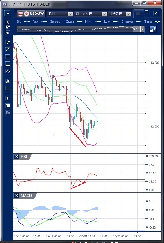 昨日のドル/円相場は、東京朝方は112円60銭水準でスタートしたもののドルの上値は重く、米医療保険制度改革(オバマケア)代替法案への反対増加報道などでドル売り基調となりじりじりと軟化、112円を割り込む動きとなりました。 この下落で、ボリンジャーバンドの下抜けとバンドウォークが発生していることが確認できます。 欧州時間に入ると、ドルの買戻しも出て112円30銭水準まで値を戻しますが、欧州株安などもあり上値が重い状況が続きました。 NY時間に入ると、米共和党が医療保険制度改革法(オバマケア)の撤廃、改革法案の成立が頓挫することで税制改革などトランプ政権の経済政策の実行に懐疑的見方が広がったこと、また米6月輸入物価指数や7月NAHB住宅市場指数が予想を下回ったことなどを受け、年内の追加利上げ観測が後退し、ドル売りに拍車がかかり、一時111円69銭まで下落する動きとなりました。 ただし、この下落で安値を更新したものの、RSIは水準を切り上げておりダイバージェンスを示しており、その後のドル反発を示唆する形となっていました。 NY引けにかけては、ドルのショートカバーが入り112円台を回復する動きとなっています。 オバマケア代替法案可決は絶望的との見方が広がっており、トランプ政権による財政支出拡大期待はほぼゼロで、米景気の先行き期待も後退しています。 しかし、FRBの金融政策正常化の意欲は強いままであり、一段のドル売りも難しいように思われ、当面は111~113円で方向感の無い動きが予想されます。 ※チャートは、ドル/円の1時間足ボリンジャーバンドRSIMACDを表示しています。