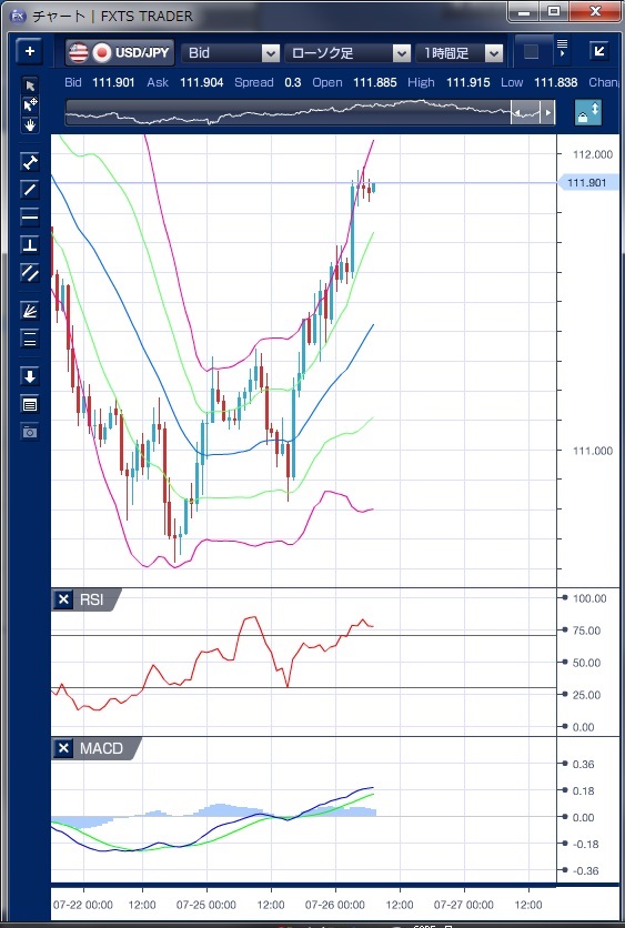 昨日のドル/円相場は、東京時間朝方は111円34銭の高値をつける局面があったものの、その後はドルの上値が重く111円を割り込み、方向性の無い取引が続きました。 米連邦公開市場委員会(FOMC)などの重要イベントを控え、積極的な売買は出にくいとの指摘もありました。 欧州時間に入り米債利回りが上昇基調で推移し、ドイツ株もプラス圏での推移を続けるなど市場はリスク選好姿勢が強まる動きとなり、ドル/円は上昇基調で推移し111円半ばまで上昇しました。 NY時間に入り、7月の米消費者信頼感が121.1と市場予想を上回り、4カ月ぶりの高水準となったことや、同時に発表された7月のリッチモンド連銀製造業指数が+14と市場予想を大きく上回り、3カ月ぶりの高水準に上昇したことを受け、ドル買いが強まり111円96銭の高値まで上昇しました。 この上昇局面では、ボリンジャーバンドの上抜けとバンドウォークの動きが確認できます。 また、MACDを見ても欧州時間の下落での売り転換が騙しに終わっており、その後のドル上昇を示唆する形となっていました。 先週に下抜けした200日移動平均線が、現在112円水準にあり、この水準がレジスタンスとなるのか、または上抜けることが出来るのかが注目されるところでしょう。 ※チャートは、ドル/円の1時間足ボリンジャーバンドRSIMACDを表示しています。