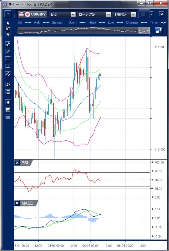 昨日のドル/円相場は、東京時間では110円台半ばで始まり、日経平均株価が堅調な推移となったことで、ゆっくりと110円台後半へと上昇しました。 この上昇で、ボリンジャーバンドを上抜けたものの、ロアーバンドは明確な下落とはならず、はっきりとしたバンドウォークとは言い難い形状でドル上昇力に強さを感じるものとはなりませんでした。 欧州時間では110円台後半での小動きが続きました。 NY時間に入ると米ADP雇用報告が発表され、市場予想を下回るものであったものの、雇用の底堅さが確認されたと見た向きがドル買い・円売りを出し、一時110円98銭まで上昇しました。 しかし、111円台に乗せることが出来なかったことやブラード米セントルイス地区連銀総裁が、利上げをさらに行えばFRBが掲げる2%のインフレ目標達成を阻害する恐れがあるとして、追加利上げに反対する姿勢を示したことが伝わったことなどを受けドル安圧力が強まり、110円29銭まで急落しました。 その後はNY引けにかけてドルのショートカバーで110円70銭水準まで値を戻して引けています。 NY時間のドル急落でMACDが売り転換しましたが、引けにかけてのショートカバーで再買い転換の兆しがあり、明確な方向性を感じるものとはいえない状況です。 明日には米雇用統計を控えていることもあり、本日も110円台での方向感の無い動きが続きそうです。 ※チャートは、ドル/円の1時間足ボリンジャーバンドRSIMACDを表示しています。