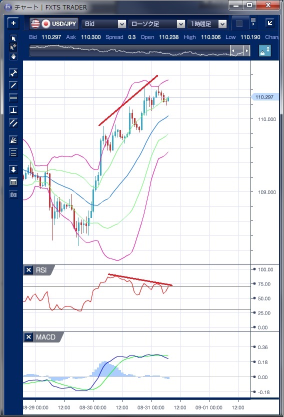 昨日のドル/円相場は、前日の海外市場でドルが安値から持ち直した流れを引き継いで上昇したものの、 110円を突破することが出来ず、その後は手がかり難で109円台後半でのもみ合いが続きました。 欧州時間に入ると、ドルは110円を上抜けたものの、すぐに反落し再び109円台後半での取引が続きました。 NY時間に入ると、8月の米ADP雇用統計が23.7万人増と市場予想を大きく上回り、5カ月ぶりの高水準となり、ドルは強含む動きとなりました。 さらに、その後発表された第2四半期の米GDP(確報値)が前期比年率3.0%増と市場予想を上回り改定値から上方修正されたことを受け、ドルは一段高となり、110円44銭の高値をつけました。 ただし、テクニカルで見ると、価格の上昇にもかかわらずRSIは軟化しており、短期的なドルの反落の可能性を示唆しています。 まら、MACDも高値圏とは言え、シグナルと交錯する動きとなっており、ドルの高値保合いの可能性が考えられます。 昨日の米国株が続伸となったことで、本日の日本株もプラス圏で始まる見込みで、本日東京市場でのドル/円は110円台前半で底堅い動きを続けることが期待されますが、北朝鮮情勢の緊迫化のリスクは依然残っており、市場のリスク回避姿勢が再び強まる可能性には留意しておく必要があるでしょう。 ※チャートは、ドル/円の1時間足ボリンジャーバンドRSIMACDを表示しています。