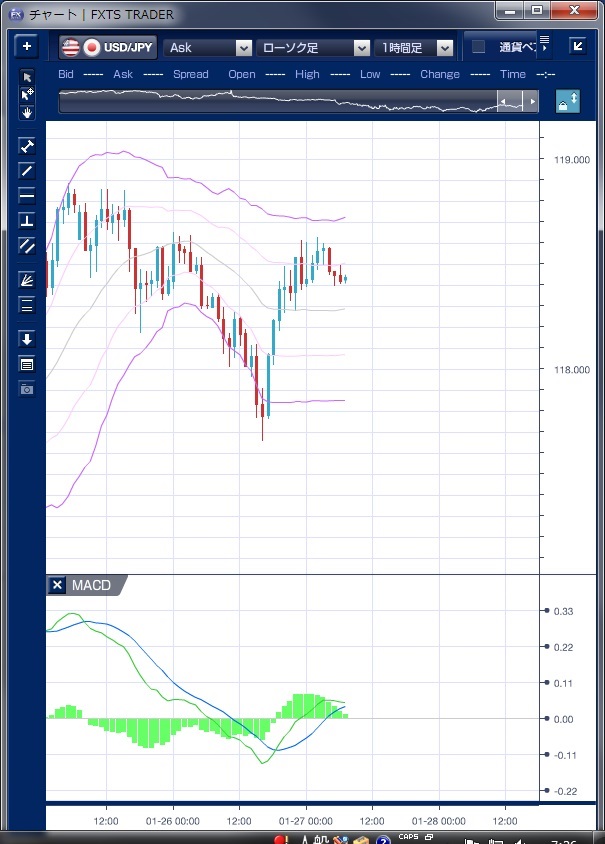 チャートは、ドル/円の1時間足ボリンジャーバンドMACDを表示しています。 昨日のドル/円相場は、東京午前では日銀に対する追加緩和期待や実需筋の買いなどで118円台を維持していましたが、日経平均が400円を超える下げ、米WTI原油先物が一時2.5%超の下落になると117円台へと押し戻される展開となりました。 欧州時間の始まりも、ドル安の流れを受け継ぎ、一時117円65銭水準まで下げました。 このドルの下落では、相場はボリンジャーバンドのロアーバンドに絡みながら動いていたものの、アッパーバンドも下がる動きであり、バンドウォークとは言えず、下落の勢いが弱かったことが示唆されています。 実際に、その後は原油が上昇に転じ、株価も下げ渋ると一転して円売りとなり118円台を回復する動きとなりました。 この反転で、MACDが買い転換していることが確認できます。 NY時間では、予想を上回った米国の住宅価格指数や消費者信頼感指数、また、1月リッチモンド連銀製造業指数が2ヶ月連続でプラスを維持したことが好感材料となり、ドル買いが優勢となり、118円62銭まで上昇しています。 もっとも、日米の金融政策に行方を見極めたいとの思惑が強く、一方向へ突き抜ける動きは出てきませんでした。