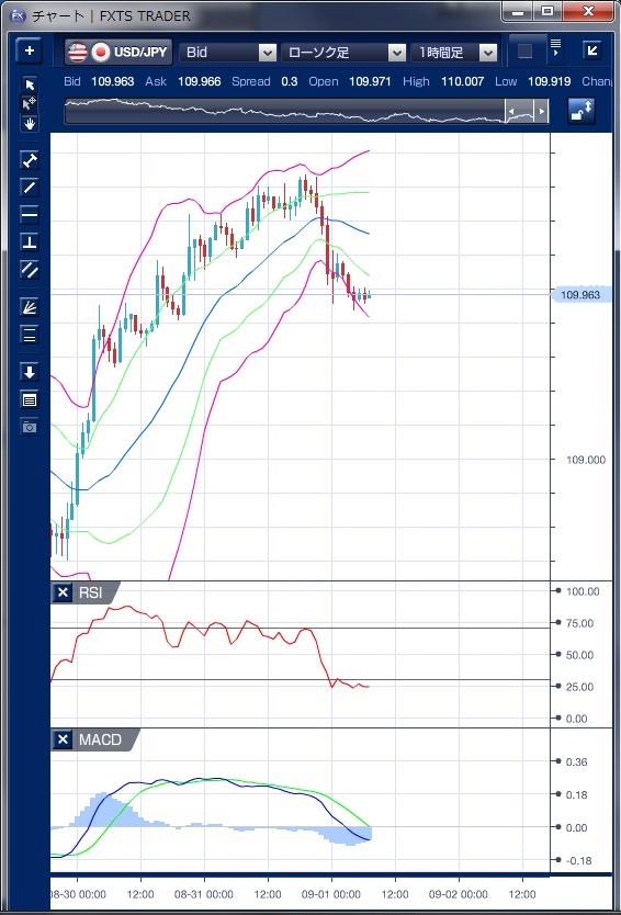 昨日のドル/円相場は、東京時間から欧州時間にかけては、110円台半ばでドルの底堅い動きが続きました。 月末ということもあり、仲値公示にかけて輸出企業のドル売りが上値を押さえたものの、仲値通過後は輸入企業や投資家のドル買いがドルの下値を支え、一時110円67銭の高値をつけました。 もっとも、この間RSIは横ばいとなっており、MACDも売り転換し緩やかに切り下がっていることから、ドルの短期反落リスクが高まってきていることが示されていました。 NY時間に入ると、米連邦公開市場委員会(FOMC)がインフレの基準指標としている米7月コアPCE価格指数が前年比 1.4%と1年半ぶりの低水準となったことや7月の米中古住宅販売成約指数が前年比-0.5%と市場予想を下回ったことをうけドル売りが強まり、さらにムニューシン米財務長官がドル安は米国の貿易にとって好ましいと発言したことが伝わるとドルは110円を割り込む動きとなり、NY午後には109円88銭の安値を付ける動きとなりました。 この下落で、ボリンジャーバンドを下抜けましたが、明確なバンドウォークは形成されず、ドル売り圧力が強くはないことが示唆されています。 ドル/円は再び110円を割ってきたものの、北朝鮮によるミサイル発射後の上昇の反動の範囲内とも言え、本日東京では110円を挟んだ動きが続きそうです。 ※チャートは、ドル/円の1時間足ボリンジャーバンドRSIMACDを表示しています。