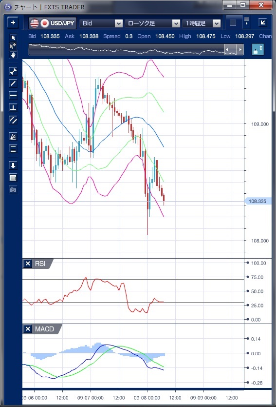 昨日のドル/円相場は、北朝鮮リスクが意識されドルの上値の重い動きが続きました。 東京朝方は前日のドル反発の流れを受け109円台で始まったものの、その後はドルじり安の動きが続きました。 欧州時間に入っても同様の流れは続きました。 ECBが市場予想通り政策金利や資産買入れプログラムといった一連の金融政策の現状維持を発表しましたが、市場の反応は限定的で、ドラギ総裁の会見を待つ形で様子見姿勢が続きました。 NY時間に入ると、ハリケーン「ハービー」の影響で米週次新規失業保険申請件数が急増、4-6月期単位労働コスト改定値も予想を下回り年内の追加利上げ観測が後退したことでドル売り圧力が強まり、さらにドラギECB総裁が10月に緩和縮小の計画を発表することを示唆したためユーロ買い・ドル売りとなり、これにつられてドル/円でもドル売りの流れとなりました。 ドル/円は、年初来の安値を下回り、一時108円05銭の安値をつけています。 このドル下落の流れで、ボリンジャーバンドを下抜けバンドウォークを形成しかけましたが、ドルの反発も早く不完全な形に終わっています。 明日は北朝鮮の建国記念日で同国政府がミサイル発射や核実験を行うとの見方も強く、ドルの上値が重い環境が続くため、108円割れのリスクには留意しておく必要がありそうです。 ※チャートは、ドル/円の1時間足ボリンジャーバンドRSIMACDを表示しています。