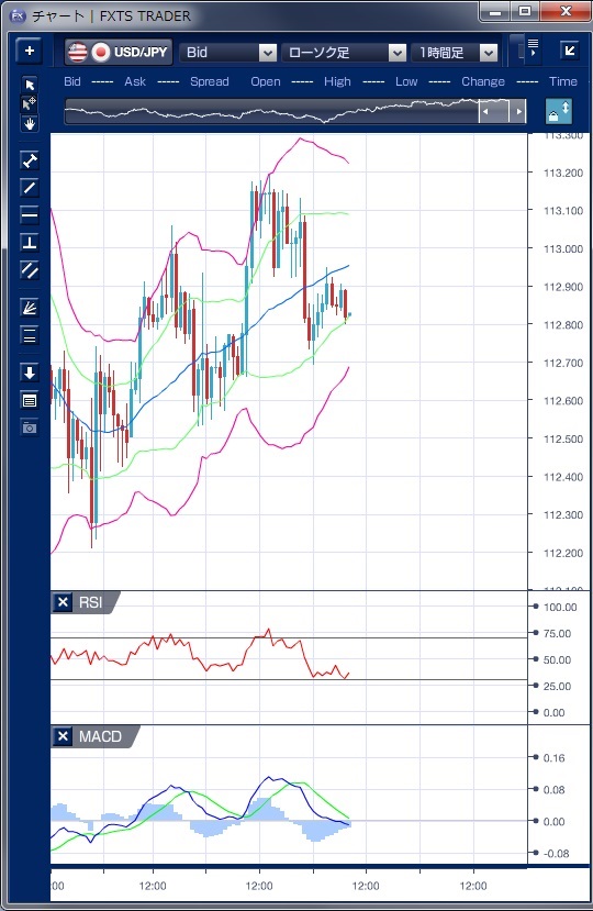 昨日のドル/円相場は、東京朝方は112円台半ばで始まったものの、株価の堅調推移や米長期金利の上昇などを支えに、じりじりと上昇し、午後には一時113円19銭の高値をつけました。 この上昇でボリンジャーバンドの上抜けとバンドウォークが起こっていますが、その前にMACDが買い転換していることが確認できます。 その後、欧州時間では113円近辺での小動きとなっていましたが、MACDが売り転換し、NY時間でのドル下落の可能性を示していました。 NY時間では、重要な指標も無く材料難の中、ポジション調整のドル売りが優勢となり112円70銭まで下押す動きとなりました。 週末の米雇用統計を前にした、ポジション調整のドル売りとの指摘があります。 ただし、今週に入ってからの動きでは、ドルの下値が切り上がって動いてきており、本日もドルの底堅い動きが期待されます。 ※チャートは、ドル/円の1時間足ボリンジャーバンドRSIMACDを表示しています。