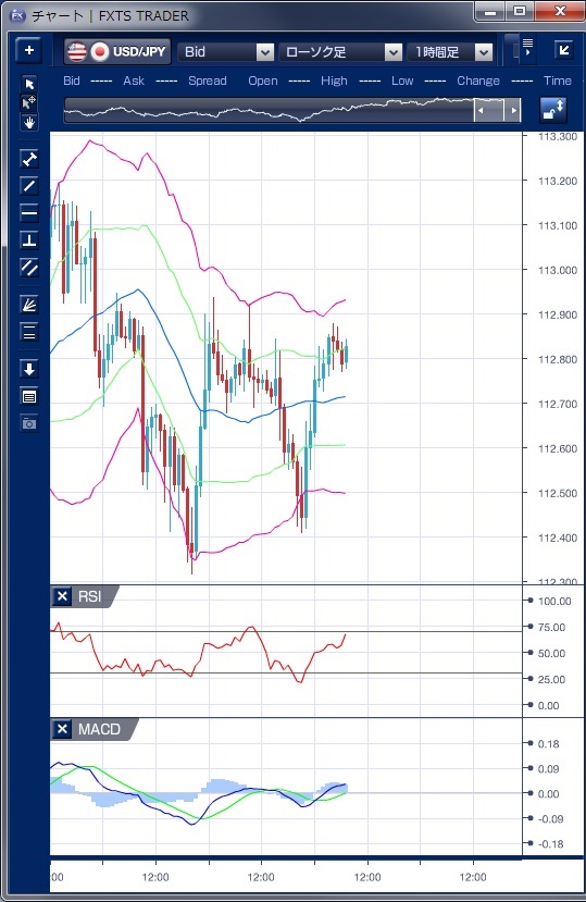 昨日のドル/円相場は、東京時間では112円台後半で膠着した動きが続きました。 その後、欧州時間に入ると、一部メディアが保守党議員から英メイ首相に辞任を求める声が出ていると報道したことを受け、英ポンド売りが強まり英ポンド/円の売りがドル/円にも波及してドルは一時112円41銭の安値をつけました。 本日発表の米雇用統計を前にしたポジション調整のドル売りの影響もあった模様です。 この下落で、ボリンジャーバンドを下抜けましたが、バンドの拡大は伴わず一過性の動きに終わっています。 NY時間では、フィラデルフィア連銀のハーカー総裁が一部メディアとのインタビューで12月の利上げを予想していると発言、さらにサンフランシスコ連銀のウィリアムズ総裁が講演で失業率は4%をやや下回る水準に低下するとの見 方を示し、インフレは2%に向かい、FRBの利上げを可能にすると発言したことで、年内追加利上げ観測を受けたドル買いが強まり112円88銭まで値を戻す動きとなりました。 本日も米雇用統計発表を控え、動きにくい展開が予想されます。 米雇用統計については、ハリケーンの悪影響が懸念されており、弱い内容を見込む向きも多く、逆に強き内容であった場合はポジティブサプライズとなりドル買いで反応するとの指摘も出ています。 ※チャートは、ドル/円の1時間足ボリンジャーバンドRSIMACDを表示しています。