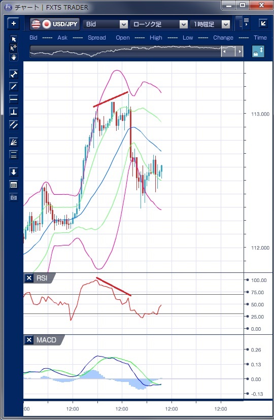 ドル円の前日の為替相場の動きを、各テクニカルで検証します。