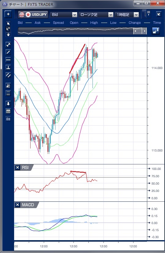 昨日のドル/円相場は、東京時間は堅調な日本株の動きを睨みながら、ドルは底堅い足取りを続け114円に迫る動きとなりました。 欧州時間も米連邦公開市場委員会(FOMC)の結果待ちで小動きとなりながらも、じり高の動きで114円台を回復しました。 NY時間に入ると、10月の米ADP雇用統計が民間雇用者数23.5万人増と市場予想を上回る伸びとなったことでドルは上昇し、一時114円28銭の高値をつけました。 ただし、この上昇で価格は高値更新したものの、RSIは切り下がっており、ダイバージェンスを形成し、その後のドル下落を示唆する形となっています。 また、MACDを見てもシグナルと交錯しており、ドルの上昇力に限りがあることが示されています。 その後、10月の米ISM製造業景況指数が58.7と市場予想を下回り、3カ月ぶりの低水準となったことを受けドルは反落、113円75銭まで下押ししました。 NY引けにかけては、米FOMCで景気判断が上方修正され、12月の追加利上げが示唆されたことでドルが買い戻され114円台を回復して引けています。 ※チャートは、ドル/円の1時間足ボリンジャーバンドRSIMACDを表示しています。