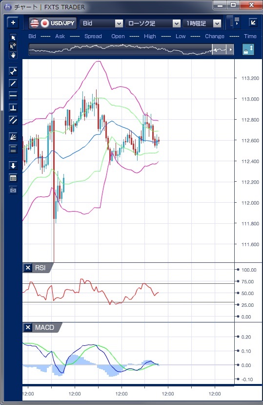 昨日のドル/円相場は、東京時間から欧州時間にかけて112円台半ばで方向感のない小動きが続きました。 MACDとシグナルがゼロ近辺で交錯しており、方向性がないことを示唆する形となっていることがわかります。 NY時間に入ると、米国債利回りが反発したことを受けてドルも上昇基調となり、一時112円87銭の高値を付けましたが、その後発表された11月の米ISM非製造業景況指数が57.4と市場予想を下回り、3カ月ぶりの低水準となったことで112円台半ばに押し戻されNYの引けを迎えています。 ドル上昇時には、ボリンジャーバンドのアッパーバンドにタッチしていますが、バンドの拡大はみられず、レンジ相場が継続していることが示されています。 週末の米雇用統計を控え模様眺めムードも強く112円台で方向感のない取引が続いています。 本日も同様の動きの継続が予想され、トレードしにくい環境となりそうです。 ※チャートは、ドル/円の1時間足ボリンジャーバンドRSIMACDを表示しています。