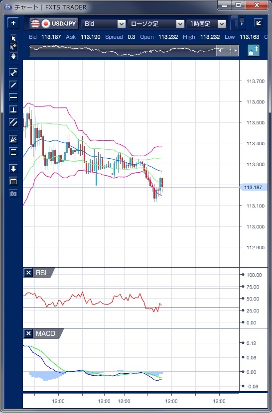 昨日のドル/円相場は、東京から欧州時間にかけては113円台前半での小動きが続きました。 典型的な年末相場となり、参加者が少なく、主要通貨では総じて方向感が出ず、ドル/円の値幅も10銭程度にとどまりました。 この間、RSIは中立の50水準で前後し、MACDもゼロ近辺でシグナルとの交錯を続け、方向性がないことを示しています。 NY時間に入ると、米債利回りの長期ゾーンが低下基調で推移したことを受け、ドルは軟調な動きとなり113円12銭の安値を付けました。 ボリンジャーバンドを下抜け、バンドウォークが形成されましたが、値幅は小さなものにとどまっています。 クリスマス休暇明けで欧米の取引参加者が増える可能性があるものの、年末年始を控え、様子見姿勢も強まりやすく、本日も動意に欠ける展開が予想されます。 ※チャートは、ドル/円の1時間足ボリンジャーバンドRSIMACDを表示しています。