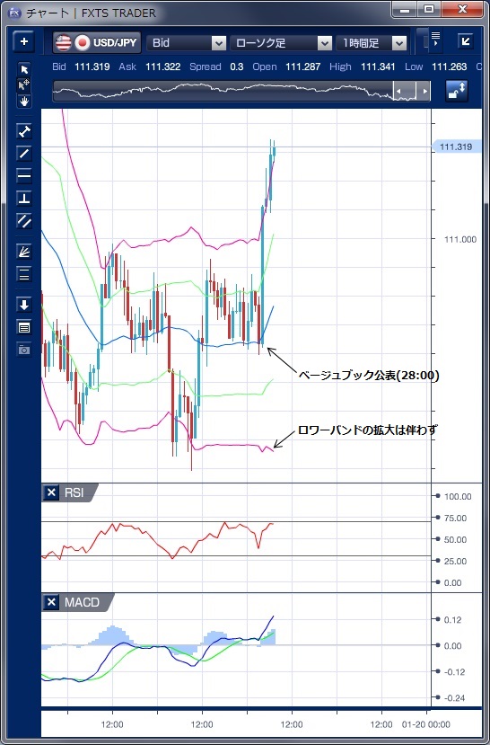 1月17日のドル/円相場は、東京時間朝方はドルが下落した海外市場終盤の流れを引き継ぐ形でドル売りが先行、一時110円19銭まで売られ、昨年9月15日以来4カ月ぶり安値をつけました。 この下落で、ボリンジャーバンドを下抜けましたが、ヒゲだけの一過性の動きに終わり、バンドウォークにはつながりませんでした。 朝方の下落で110円割れを試すことができなかったことで、ドルの底堅さが確認され、その後はドルが買い戻される動きとなり、東京午後には110円台後半まで値を戻しました。 欧州時間に入ると110円台後半で方向感のない動きとなり、NY中盤までこの動きが続きましたが、NY終盤に入ると、米連邦準備制度理事会(FRB)が地区連銀経済報告(ベージュブック)を 公表し、全米地区で緩やかないし緩慢な経済成長が確認されたことを示し、3月の追加利上げが一層確実視されることとなったことや、エバンス・シカゴ連銀総裁やカプラン・ダラス連銀総裁のタカ派発言もあり、米債利回りが上昇し、これを埋めてドル/円も111円台を回復しました。 この上昇で、ボリンジャーバンド抜けて、アッパーバンドに絡んで推移していますが、ロワーバンドの拡大が伴わず、バンドウォークというには歪な形となっており、ドル上昇トレンドというよりはドル売りの短期調整と見たほうがいいかもしれません。 当面は、昨日の110円前半でドルが底打ちしたかどうかを見極めたいところです。 ※チャートは、ドル/円の1時間足ボリンジャーバンドRSIMACDを表示しています。